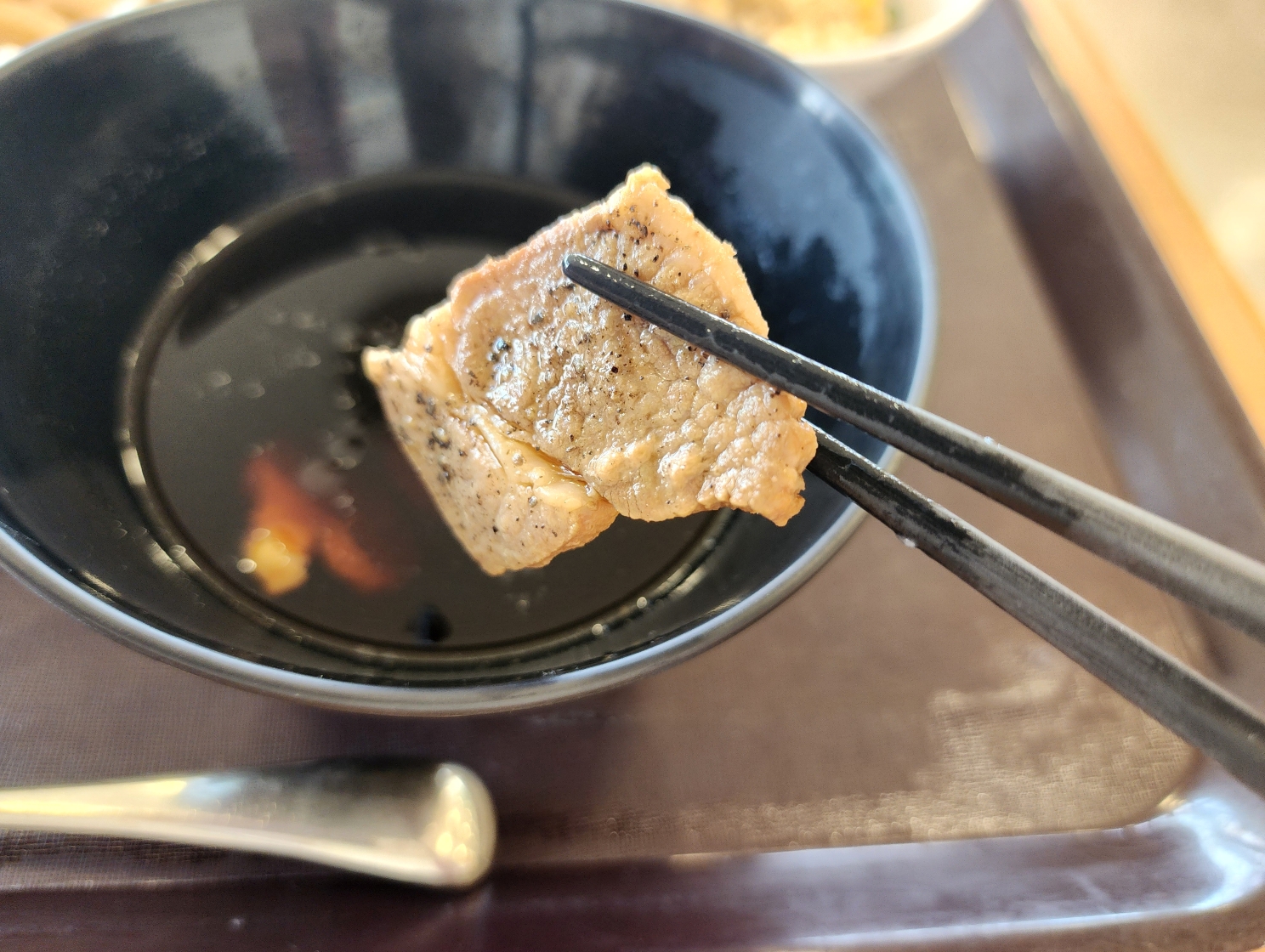 つけ汁は『さくらごはん』のオープン時に老舗そば屋さんにアドバイスをもらって完成させたというかつお醤油味で、具は豚の肩ロース肉。使われているのは山形県酒田市産の庄内豚だ。「コンベクションオーブンを使って調理することで、焦げ目もついてジューシーに仕上がっています」と、小川さんが教えてくれた。