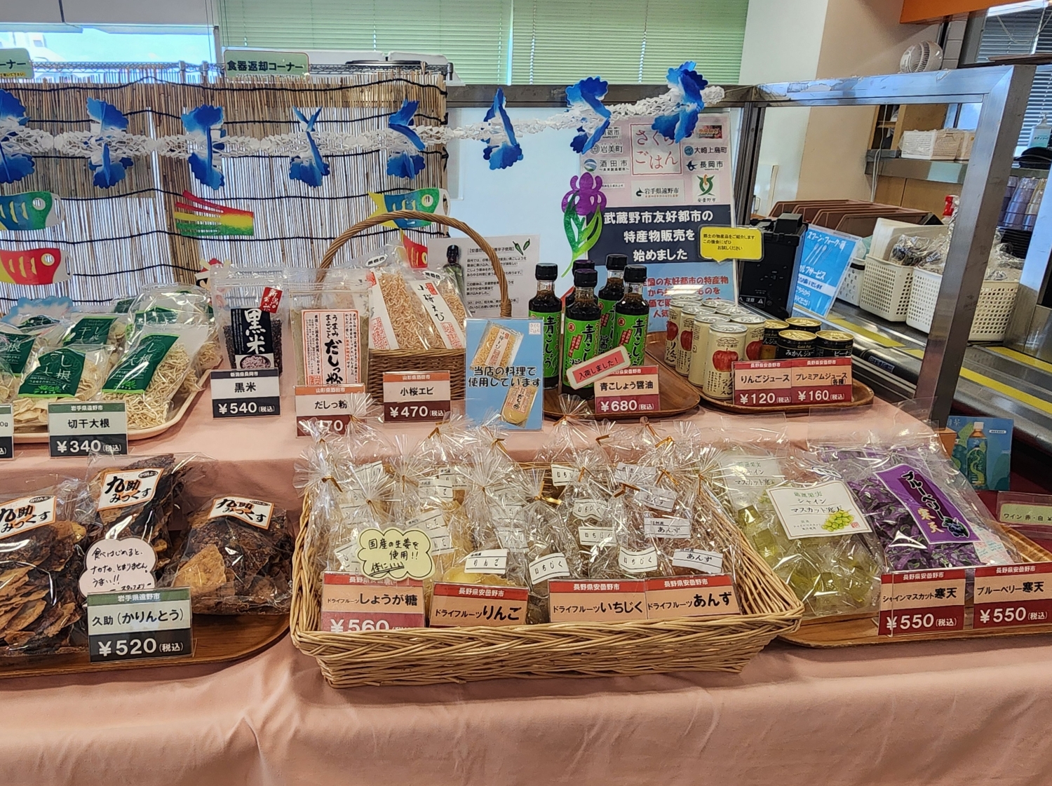 日替わりメニューには、岩手県遠野市の豚肉や長野県安曇野市の信州サーモン、千葉県南房総市の干物など、武蔵野市の友好都市の食材を使った料理も登場する。武蔵野肉汁うどんにも使われている庄内豚の産地である山形県酒田市も友好都市の1つ。