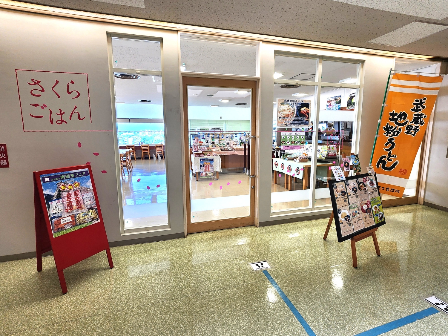 正面玄関から市役所に入り、エレベーターで8階まで上がる。エレベーターを降りて右へ進むと、右側に食堂『さくらごはん』の入り口が現れる。