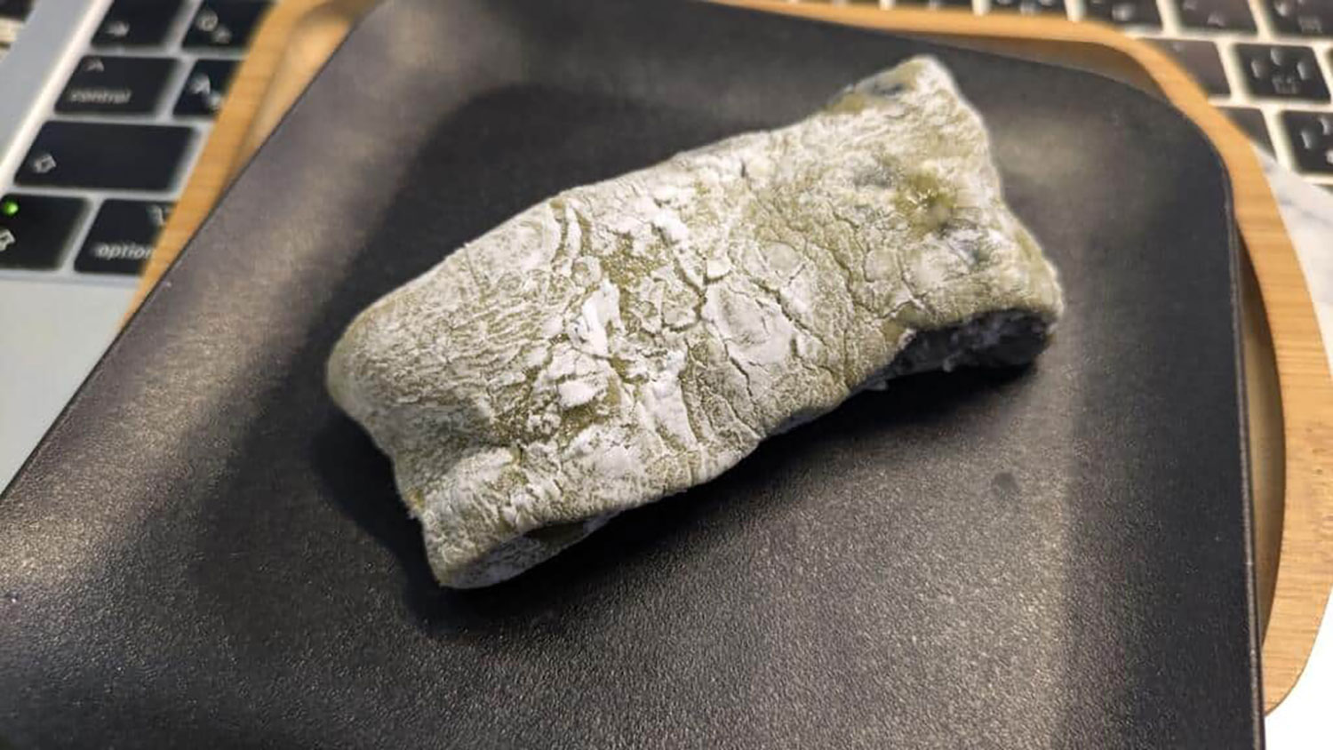 聞き慣れない名前ですが、メレンゲを餅で包んだオリジナルの和菓子だそうです。こちらは宇治抹茶を使ったもので、中に黒豆が入っています。