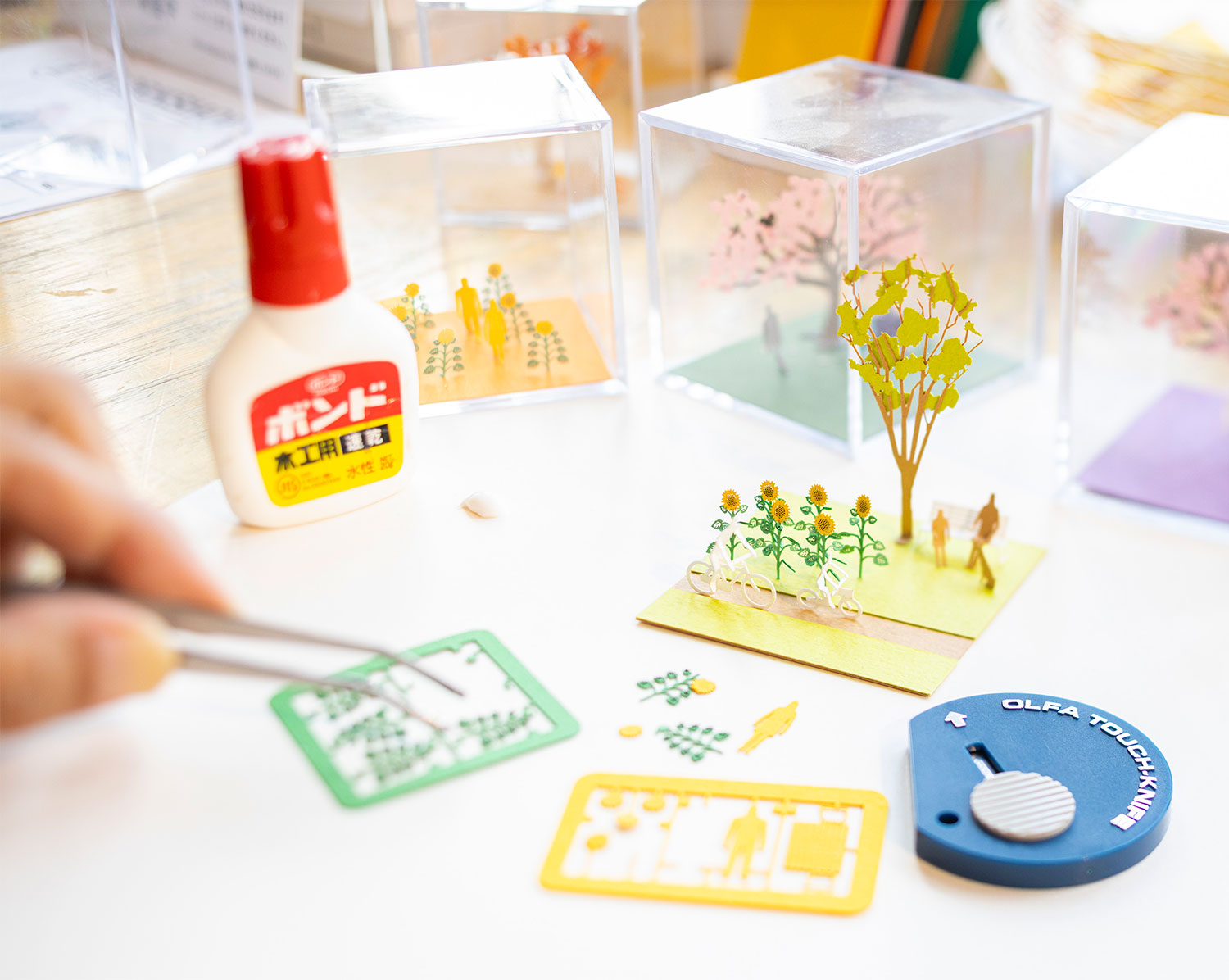 爽快な国営昭和記念公園に足を向ければ『TiSTORE』で大人たちが陳列の紙飛行機を試していた。共同運営する立川観光コンベンション協会の木嶋雅史さんは、「立川のアートは日常的に触れる作品が多く、子供たちも美術館やギャラリーで触りたがります。それも立川らしさ、と言えるかも」と笑う。同じく共同運営の『福永紙工』の駒村壮太さんは「1/100建築模型用添景のテラダモケイのワークショップを見ていると、樹木からひまわりを咲かせるなど、お客さまの発想が自由。見ていて新鮮です」と頬を緩ませる。