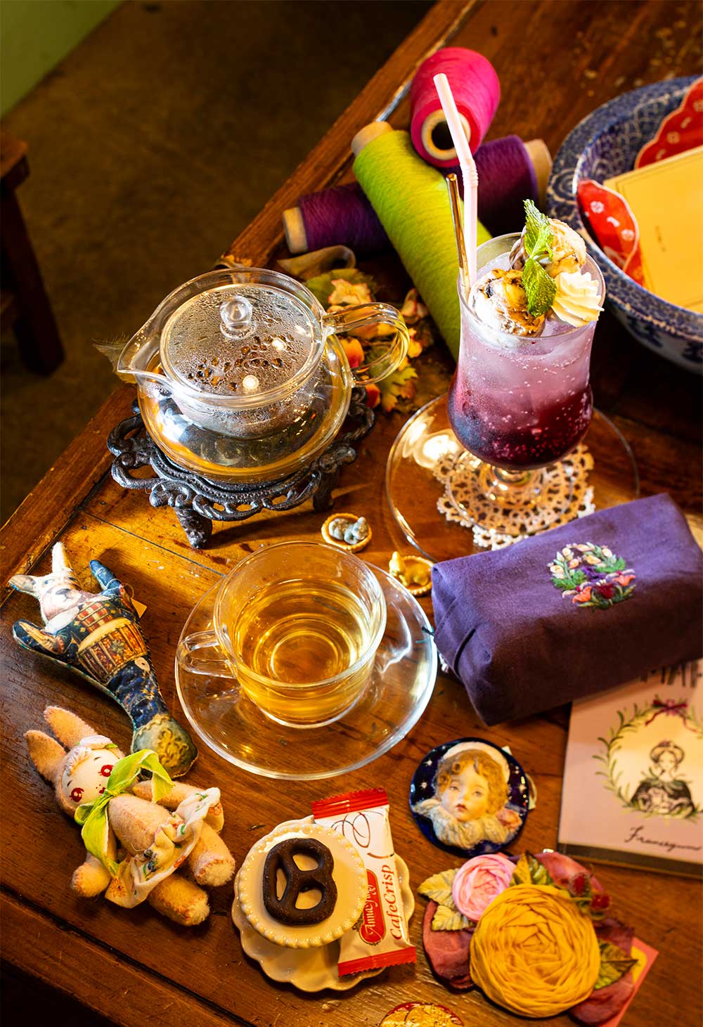 アンティーク着物が軒先ではためき、店では着物にエプロン姿の店主・オケモトノリコさんが給仕。奥の作家部屋に踏み入れば、かわい金魚さん、リルガさんなど、名うて作家の作品が2025年のテーマ「小川洋子著の最果てアーケード」に合わせ、月替わりで並ぶ。クリームソーダで喉を潤し、ハーブティで心を癒やし、1日過ごす人も少なくない。
