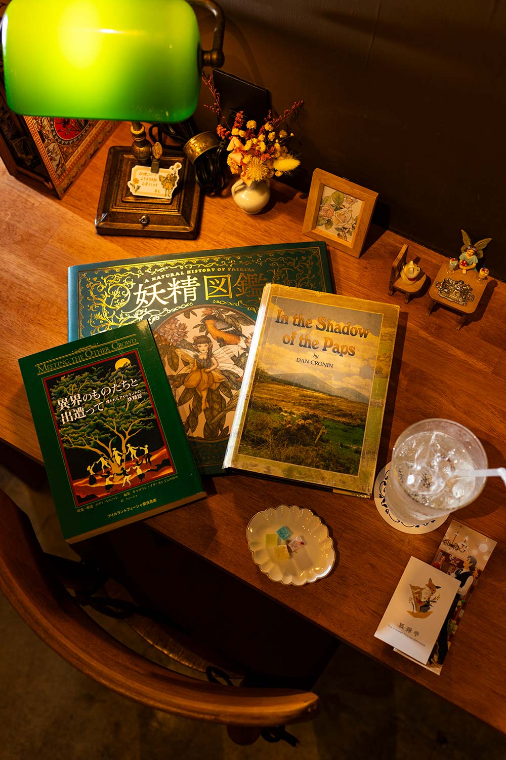 店主の高畑吉男さんは大学で妖精学を教えながら、2025年2月に本屋を開店。メルヘン、文学、スピリチュアルなどの新刊、雑貨も販売するが、店の一角を占めるのはケルト神話が主軸の、妖精にまつわる自身の蔵書群。日本に1冊しかない原書や図鑑は、サロンでドリンク片手にページをめくりたい。「アイルランド妖精譚の語りの会」、古楽器の演奏会も毎月開催。