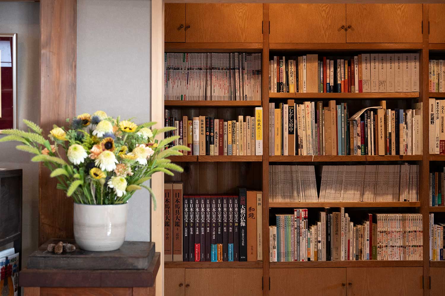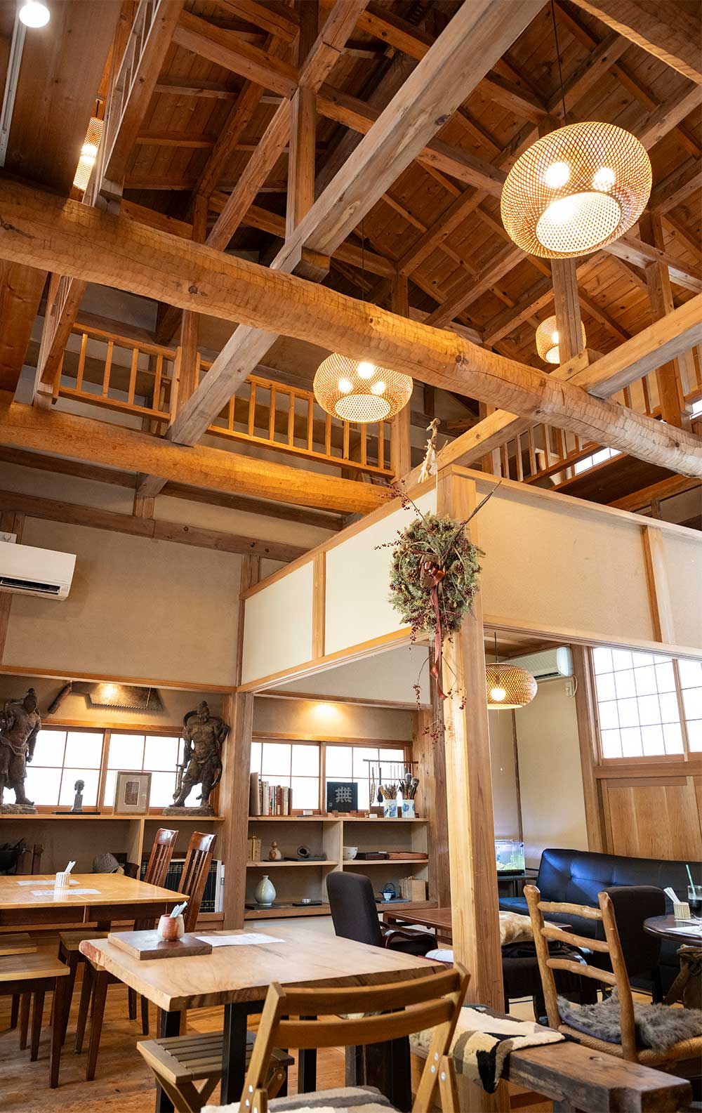 地域の人のためのくつろぎの場を目指し、彫刻家・關頑亭(せきがんてい)さんのアトリエを改装。約2.4mの弘法大師座像を作るために設計され、木の香りと高い天井が気持ちいい。頑亭先生が大切にしていた“本物”の作品が展示され、親交の深かった山口瞳氏の直筆原稿も。頑亭先生の書庫に並ぶ本を読んだり、ランチやお茶を楽しんだりといろんな過ごし方ができる。