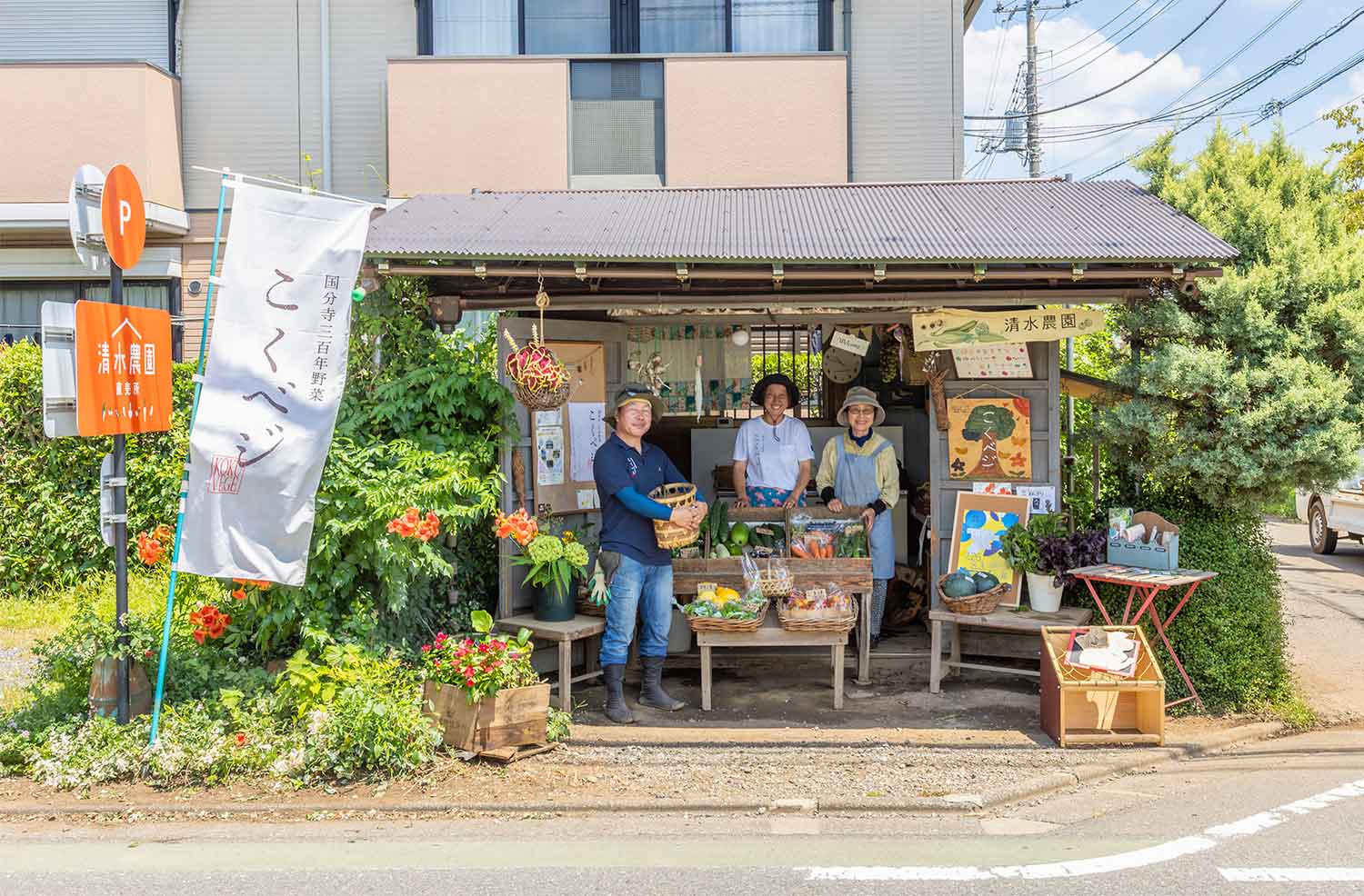 現・国分寺市北町で5代続く農園。堆肥から自分たちで作り育てる野菜は、例えば茶豆は濃厚な味わいで、四葉(スーヨウ)キュウリはみずみずしい。直売所は主に母のケイ子さん・妻の美知さんが担当。各野菜のおすすめレシピも教えてくれる。雄一郎さんは、国分寺の農業を盛り上げるこくベジプロジェクトに創設時から参加。市民農業大学の講師も務める。