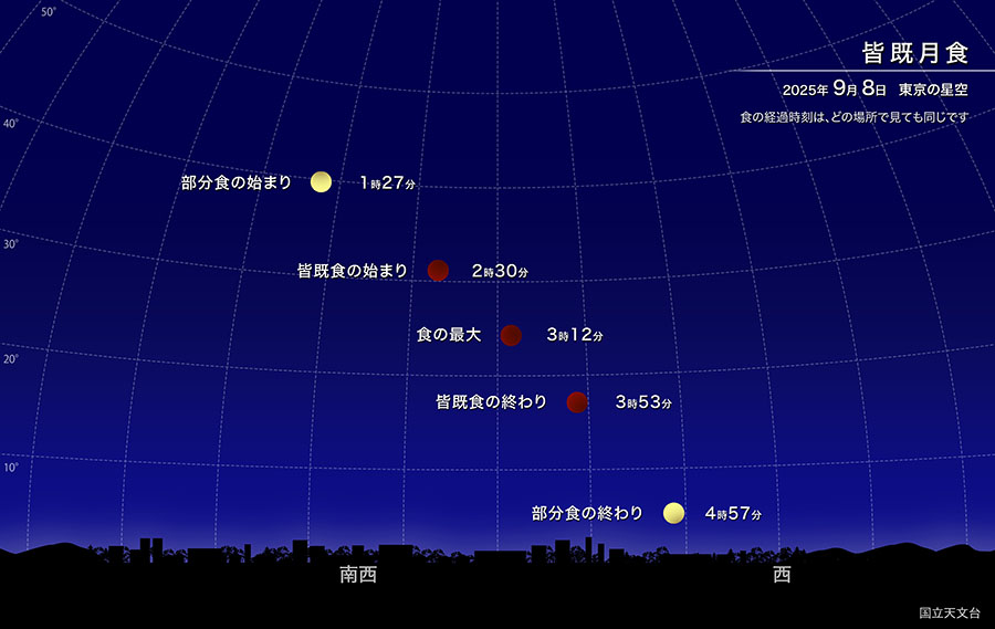 皆既食を楽しめる時間は午前2時30分から3時53分までで、その後は4時57分まで再び部分食が続きます。日本全国、どの場所からでも同じ時間帯に楽しめます(※8日の夜ではなく、7日の深夜~8日の明け方であることに注意してください)。