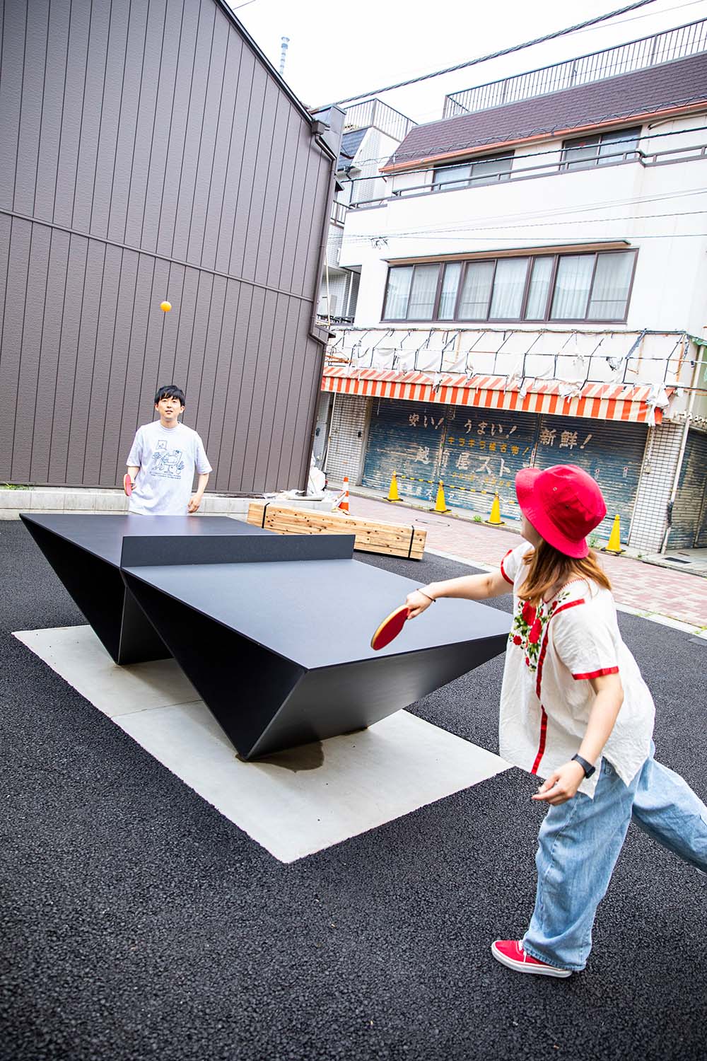 空き地に置かれたかっこいい卓球台は、誰でも無料で使用OK。ラケットセットは近隣の数店舗で借りられます。
