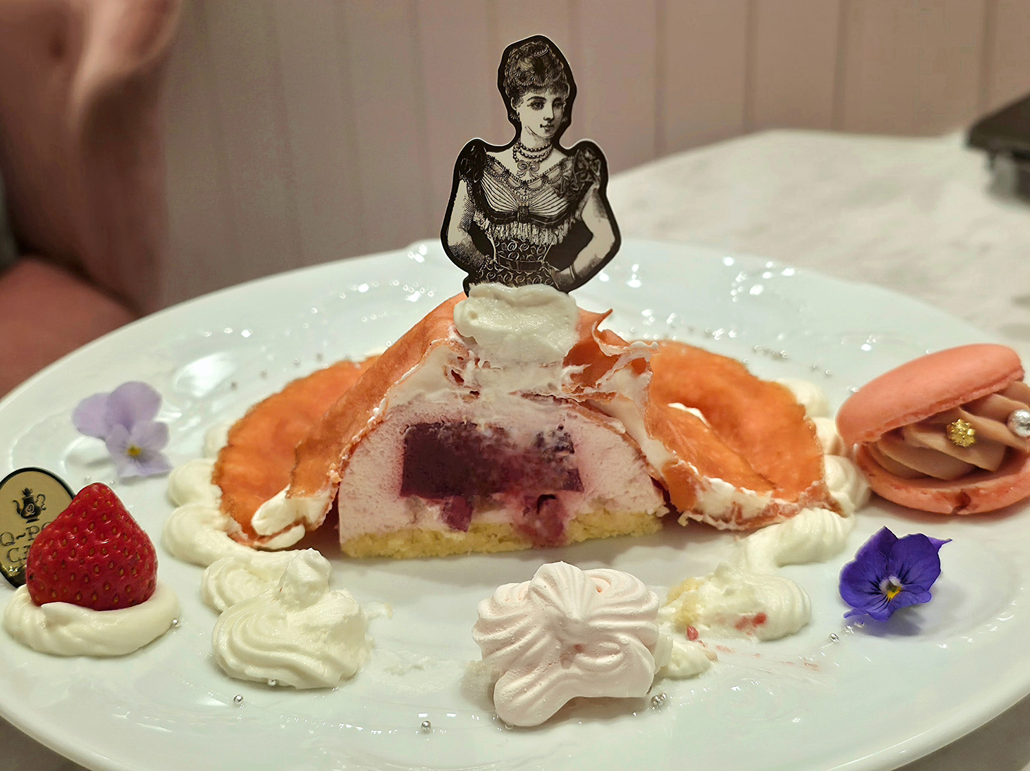 その舞踏会を彩るのは、ブルーベリーガナッシュをサンドしたマカロン、ピーチチュイル、メレンゲ、カシスクリーム、シュトロイゼル、パールクラッカン、ジェノワーズ。