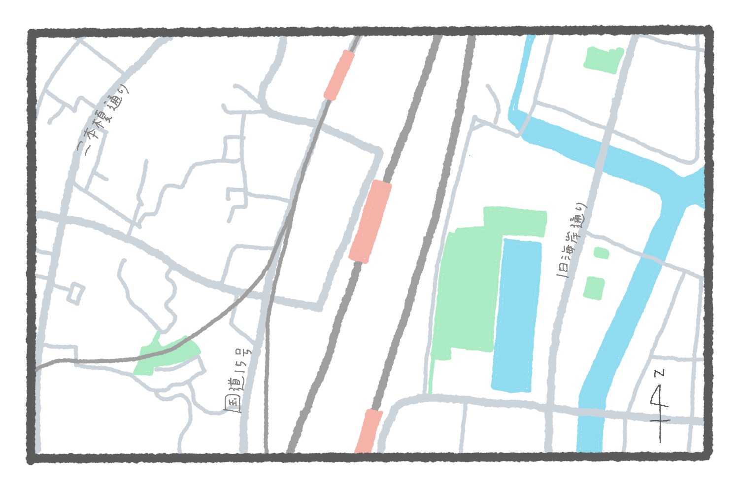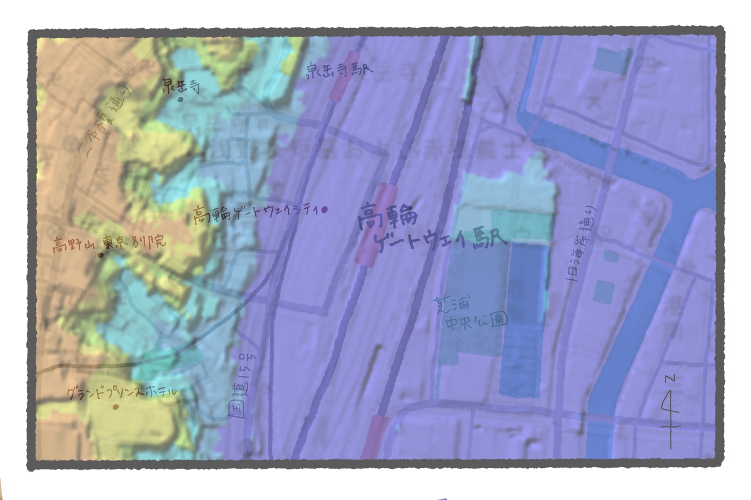 地図の文字を外して模様だけを眺めることで、地形や歴史が浮かび上がってくることもある。高輪ゲートウェイ駅周辺はまさにそんな場所だよね!