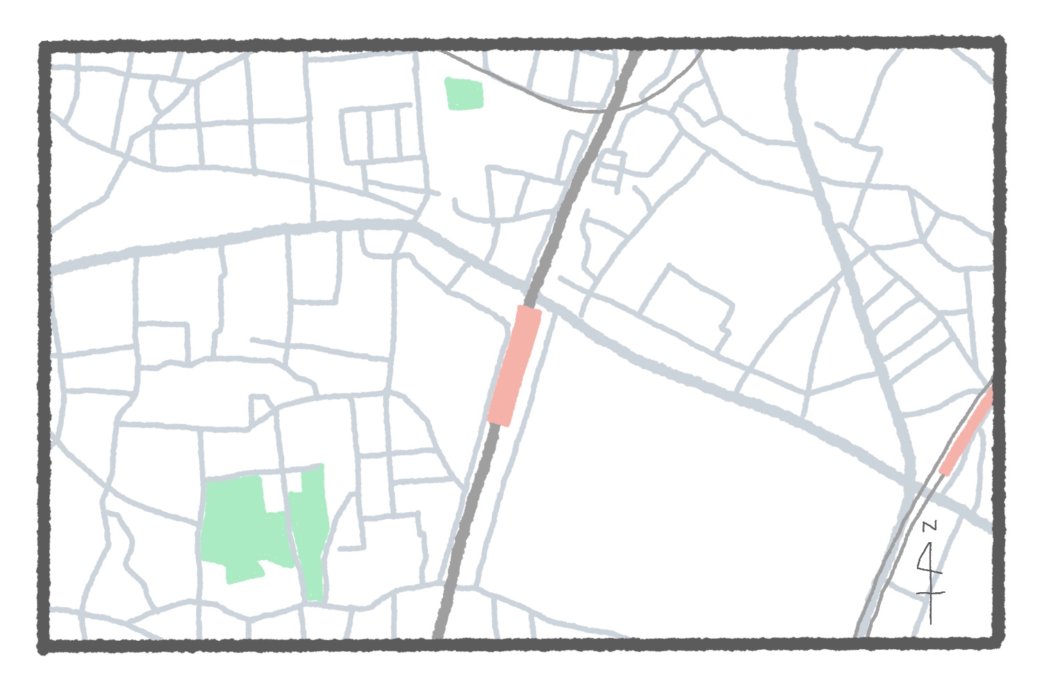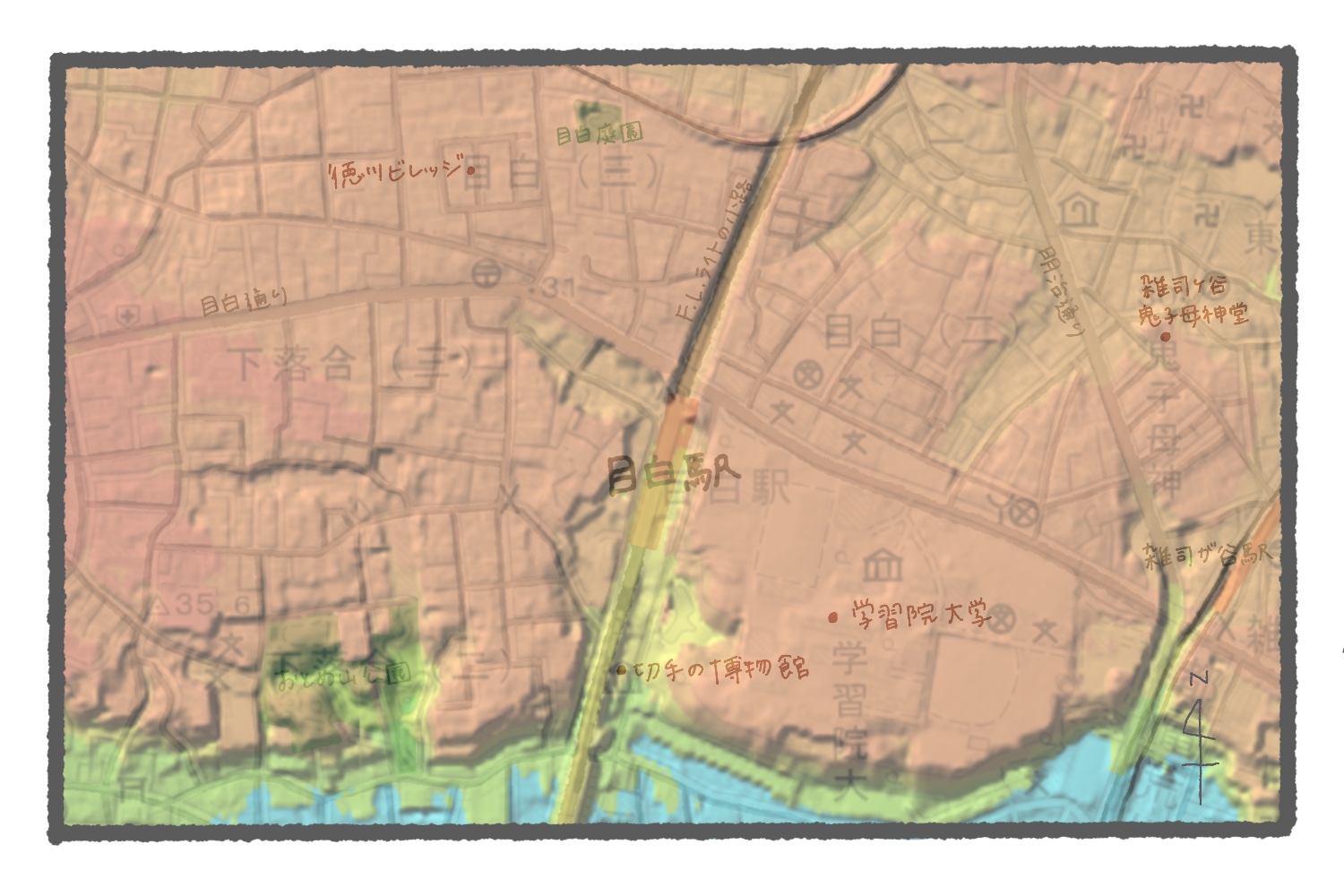 地図上で目立つ特徴は、駅の北側で線路と交わる目白通りと学習院大学の敷地。この目白通りは、江戸と清戸(現在の清瀬市)を結んでいた清戸道がもとになっている。また、道の模様が不規則で広い敷地がありそうな地図模様から、高台ではないかと推測可能。実際、目白は江戸時代から武家屋敷が多く明治以降は高級住宅地であり文教地区でもあるエリアで、学習院大学がある場所はまさに神田川の谷を見下ろす高台。地図左下のおとめ山公園も、大正初期にこの周囲一帯を住まいにしていた相馬家の庭園が原型だ。