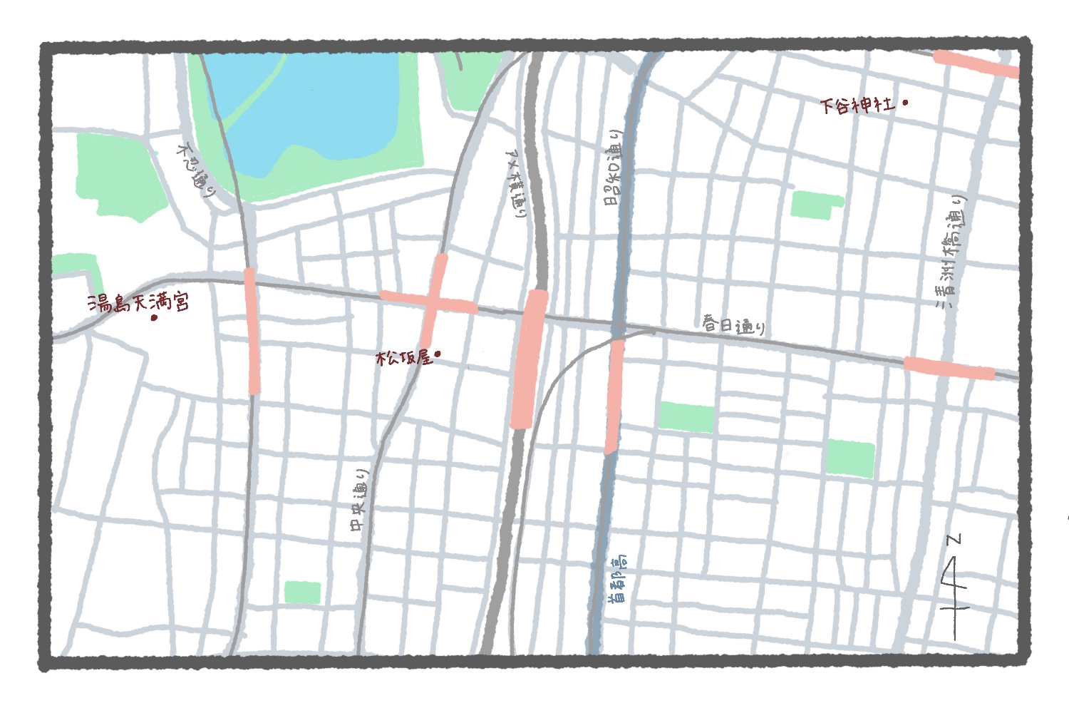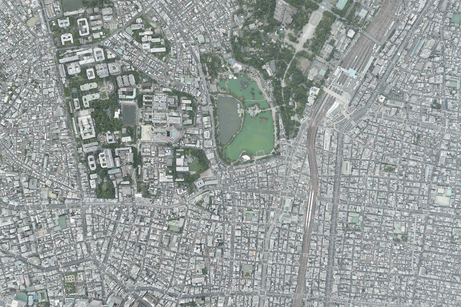 一番初めに目につくのは、なんといっても左上。これは上野公園と不忍池で、山手線の駅のそばにこれほど大きな池がある場所は上野駅か御徒町駅だけと言っていい。皇居のお堀や湾岸地区の可能性も捨てきれなくはないが、この形と大きさはやっぱり不忍池である。東京都内で池と名のつくもののなかでは、吉祥寺の井の頭恩賜公園に続いて2番目に大きい。周囲約2kmで、今回の地図からは見切れているものの中央に弁財天を祀った島があり、南の蓮池、西のボート池、北の鵜の池の3つに分かれている。