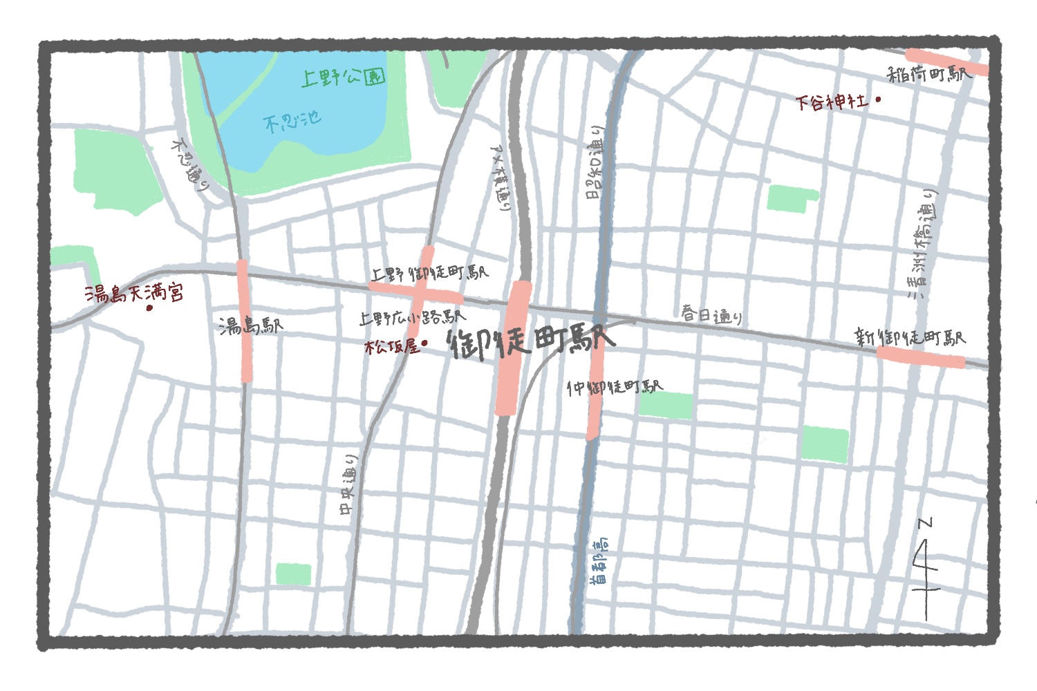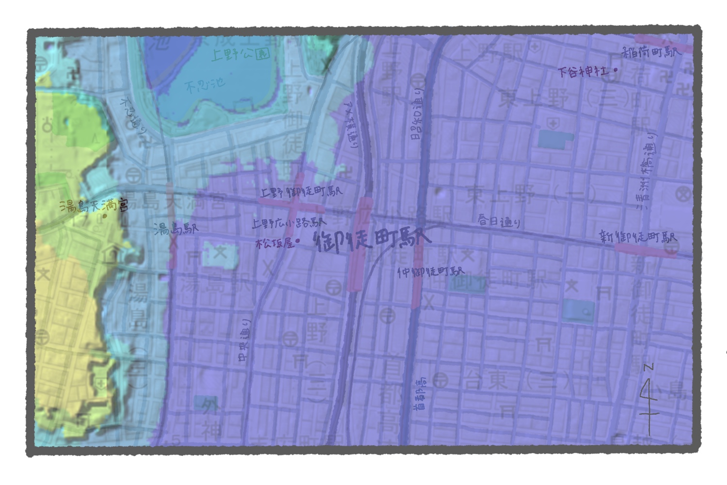 不忍池でピンと来なかったとしても、ヒントはまだまだある。まず気がつくのは、他の路線とその駅が多くて絶妙に離れていること。地下鉄千代田線の湯島駅に、地下鉄大江戸線の上野御徒町駅、地下鉄銀座線の上野広小路駅、地下鉄日比谷線の仲御徒町駅、さらにつくばエクスプレスと日比谷線の新御徒町駅も見えている。この駅の多さと距離感は、他の駅にはない特徴だ。