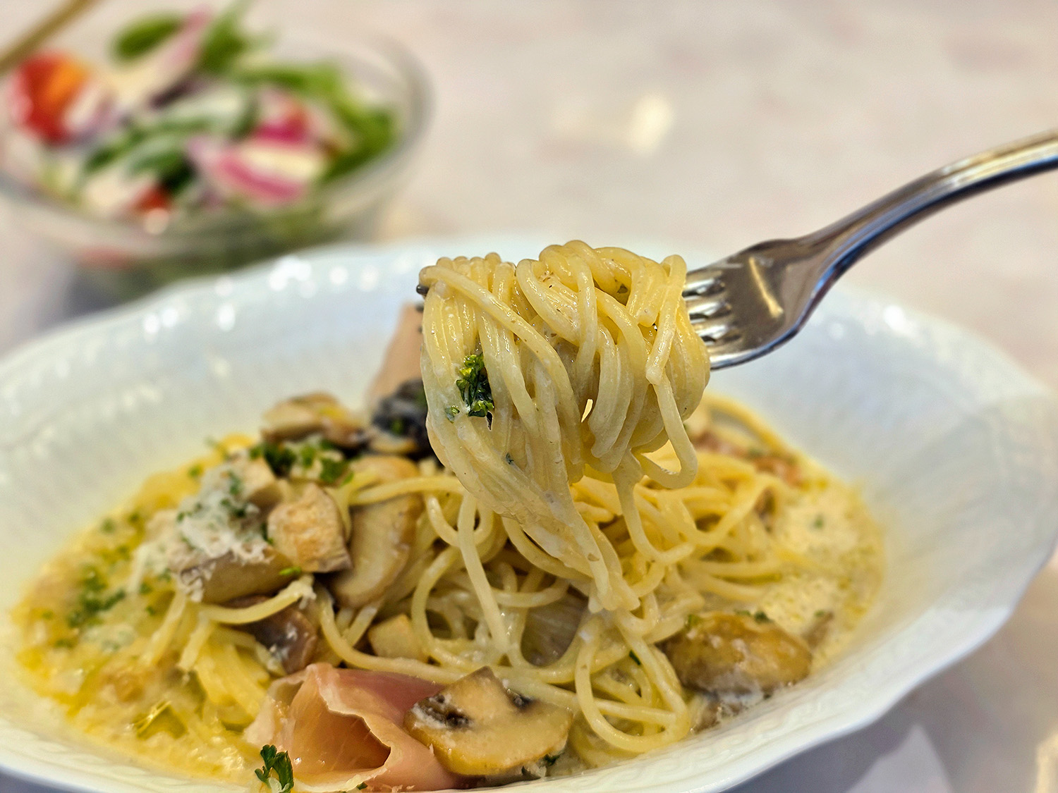 トリュフと生ハムの贅沢なクリームパスタは、あっという間にペロリのおいしさにゃー♪