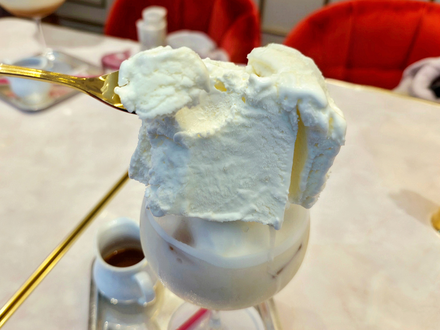 キャラメルとバニラ香るフレーバーベースのロイヤルミルクティーの上に、グラスと同じくらい盛り盛りのココナッツアイス。