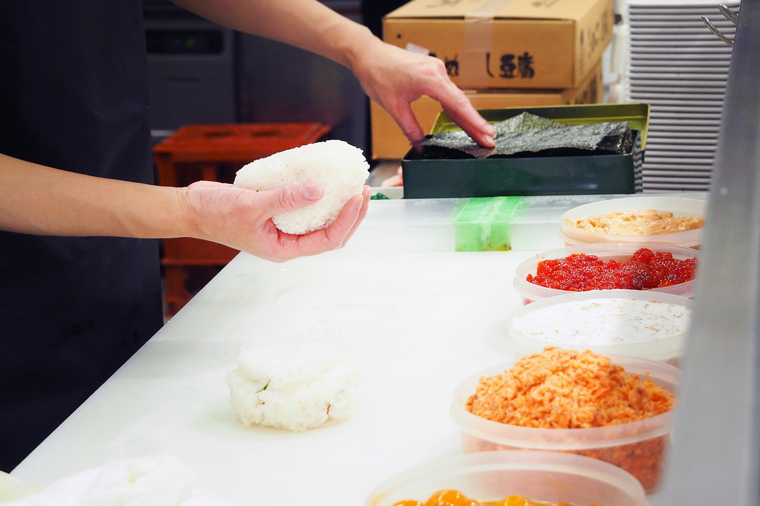 お米は新潟県岩船産のコシヒカリを使い、創業当時からあまり変わらないという具材が50種以上! おにぎりは1個400円(具材により450~500円)、お新香250円、とうふ汁200円。現在は数人のスタッフが右近さんの技を受け継いで握っているが、大切にしているのは食べる人を思うこと。「おにぎりは自分の子供のような存在。その味を伝えていきたいです」と右近さん。茶碗一杯分ほどある大きなおにぎりを頬張ると、お米の甘みと具材の塩気が心の芯に響くような感覚になる。