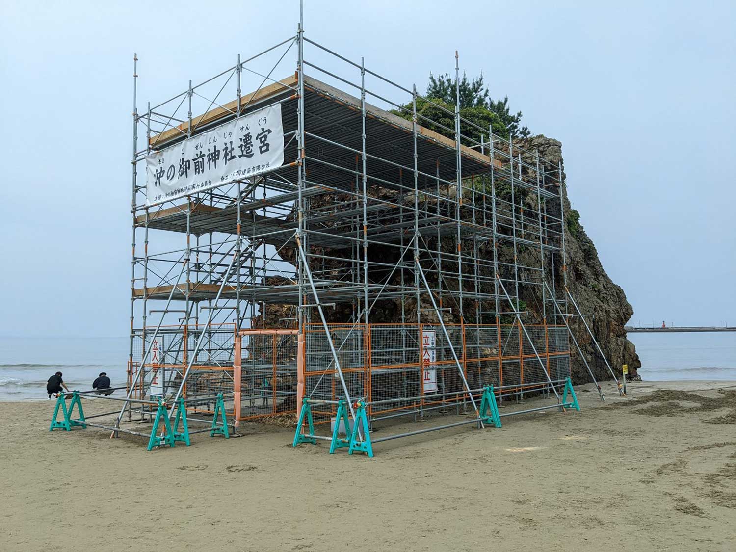 出雲大社から歩いて20分ほどのところに「稲佐の浜」がある。砂浜の一角にポツリとある「沖御前神社(おきごぜんじんじゃ)」は2025年に遷宮を迎えた。このときは岩の上にあるお社の建て替えに向け、足場が設置されていた。