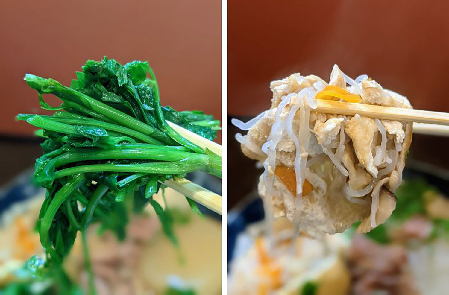 セリはちゃくしゃくとした歯ごたえが心地よく、香りが鼻に抜ける。巾着を開けてびっくり。人参、鶏肉、キノコ、糸こんにゃくがぎっしり詰まっていて、まるで小さな鍋を食べているような満足感。ひと口ごとに、異なる味と食感が現れて、まるで“おでん島”の宝探しをしているようだ。