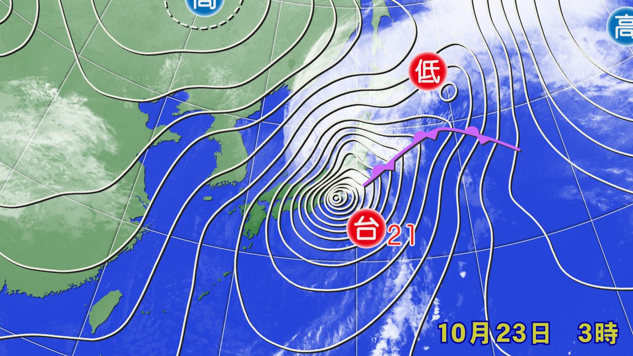 大雨となった10月25日の天気図を振り返ると、本州の南岸沿いに低気圧、そして日本の東海上に台風第21号があります。台風第21号は日本へ接近しなかったものの、間接的に大きな影響をもたらしました。