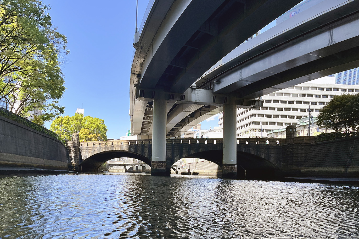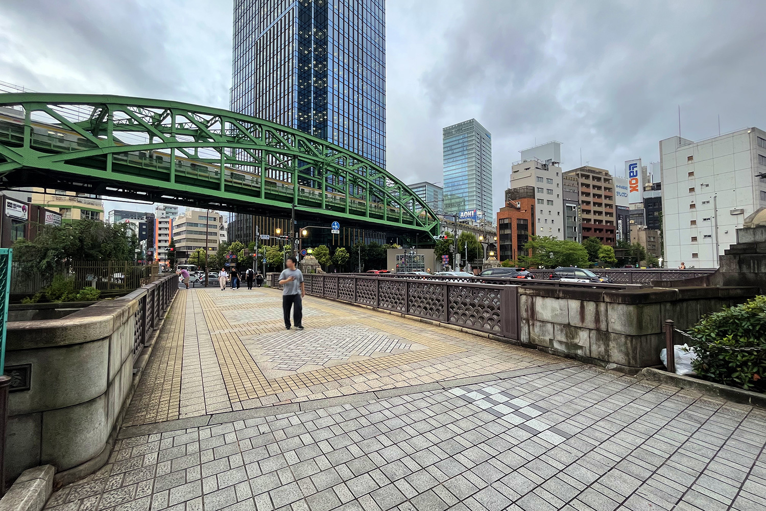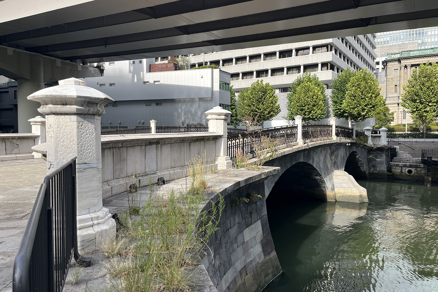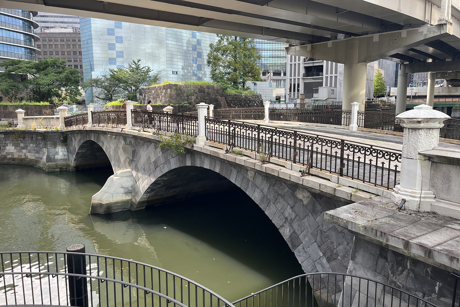 2連アーチの形や頭上の首都高の高架が大きなヒントであることは言わずもがな、注目したいのは橋の奥に写っている石垣。これは江戸城諸門のひとつ・常磐橋門の名残。常盤橋門は奥州道中につながる江戸五口のひとつで、残った枡形石垣の一部は常磐橋とともに国の史跡に指定されている。