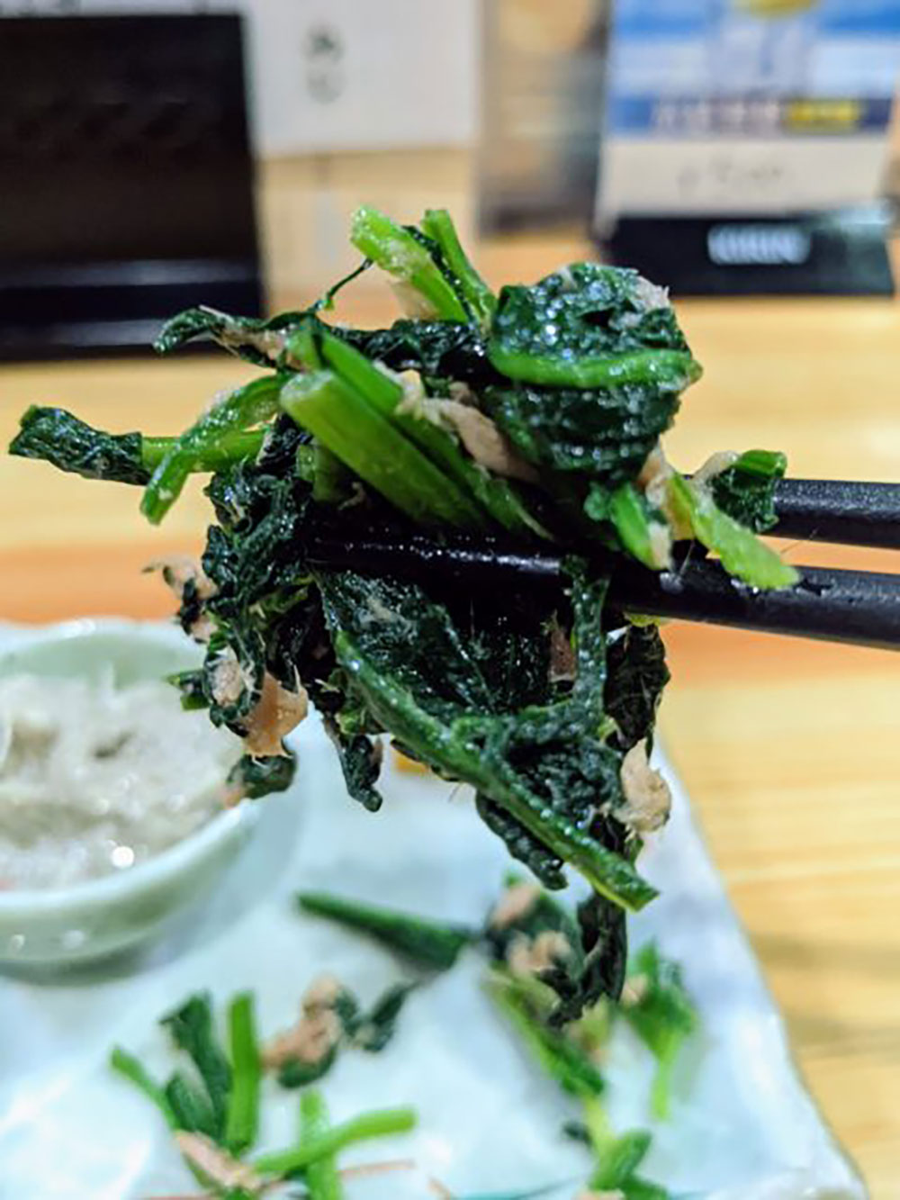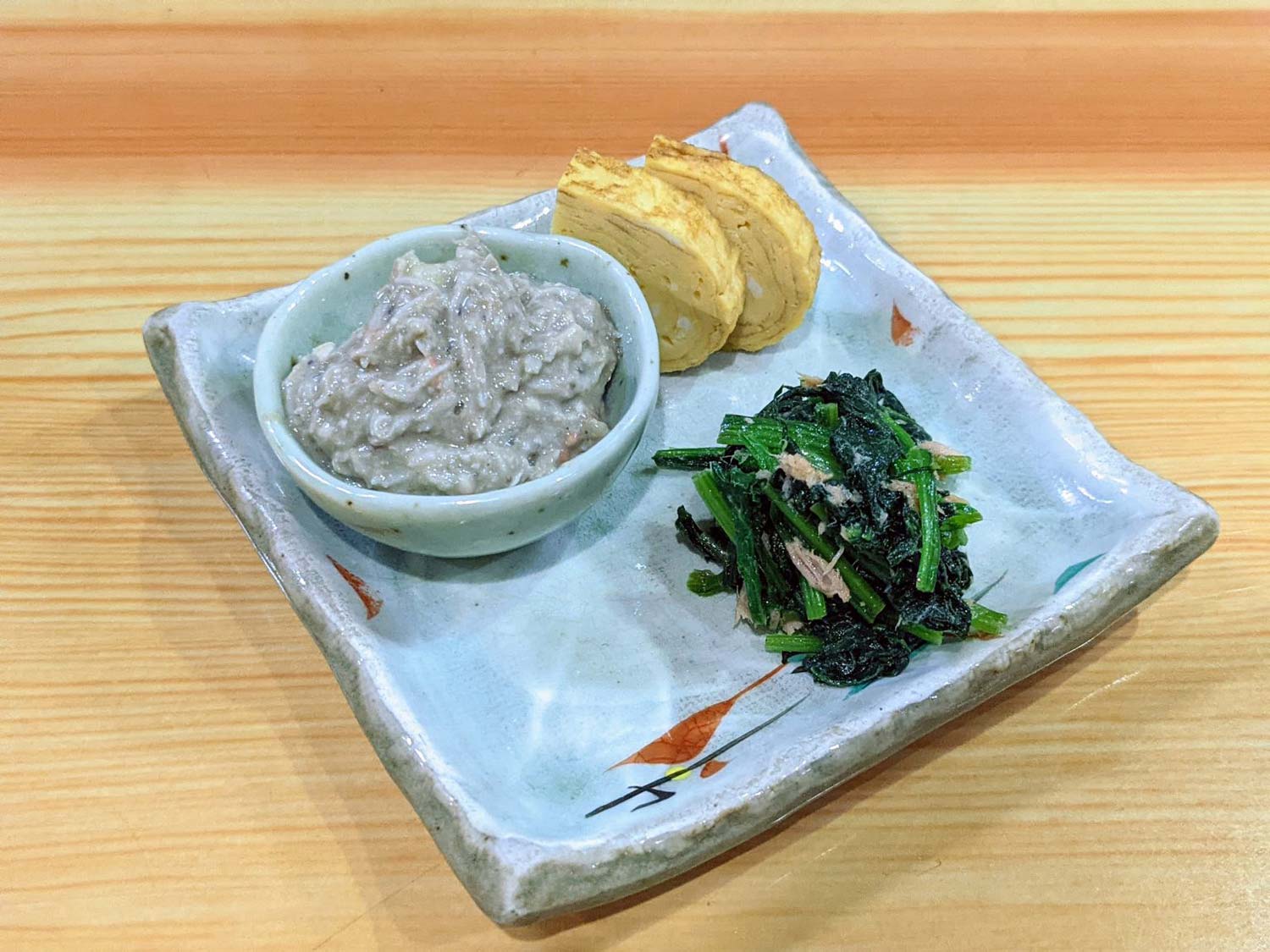 玉子焼きはやさしい甘さで、蟹味噌の余韻を包み込むように口の中を整えてくれる。そして、ほうれん草とシーチキンの和え物。