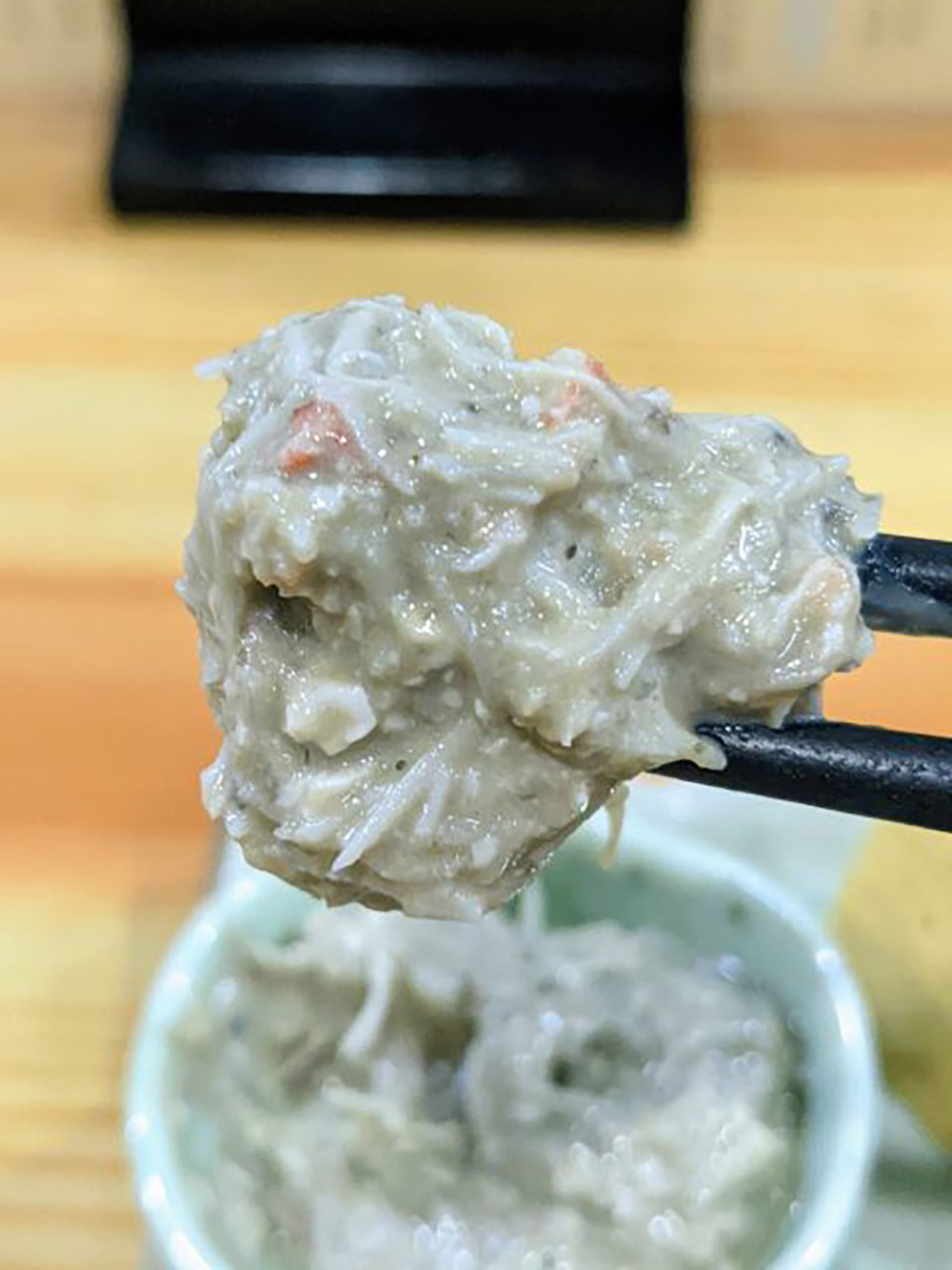 まず運ばれてきたのは「お通し」。一品だけじゃないお通し、イイ。蟹味噌のほぐし身は、ひと口で海の濃厚な香りが広がる。蟹味噌の旨味がしっかりと主張していて、思わず酒が止まるほど。