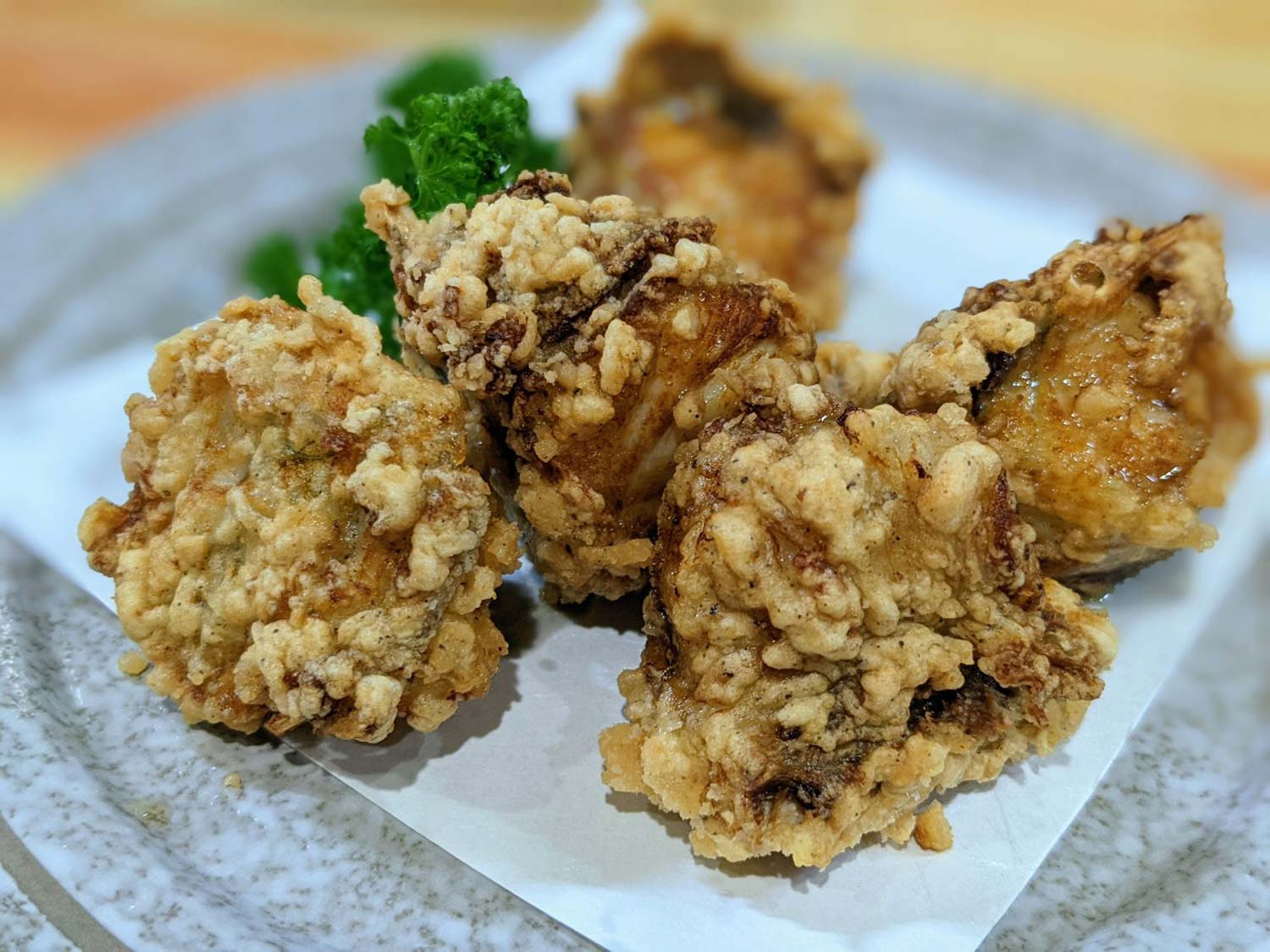 ちょっぴり奮発「フグの唐揚げ」。これまで何度か食べたことはあったが、どれも小ぶりで少しパサついていた印象が強かった。