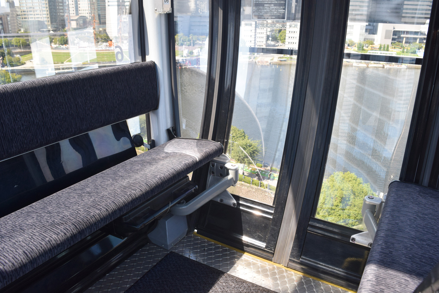 キャビンの定員は最大で8名とのことで、一人で乗り込むと内部はゆったりと広い。暑い日だったが、クーラーがしっかり効いていて快適だ。乗り場内ではゆっくりと乗り込みやすい速度で移動していたキャビンだが、乗り場を離れて出発する時はスーッと浮遊していくような滑(なめ)らかなスピードになった。その瞬間が心地よかった。