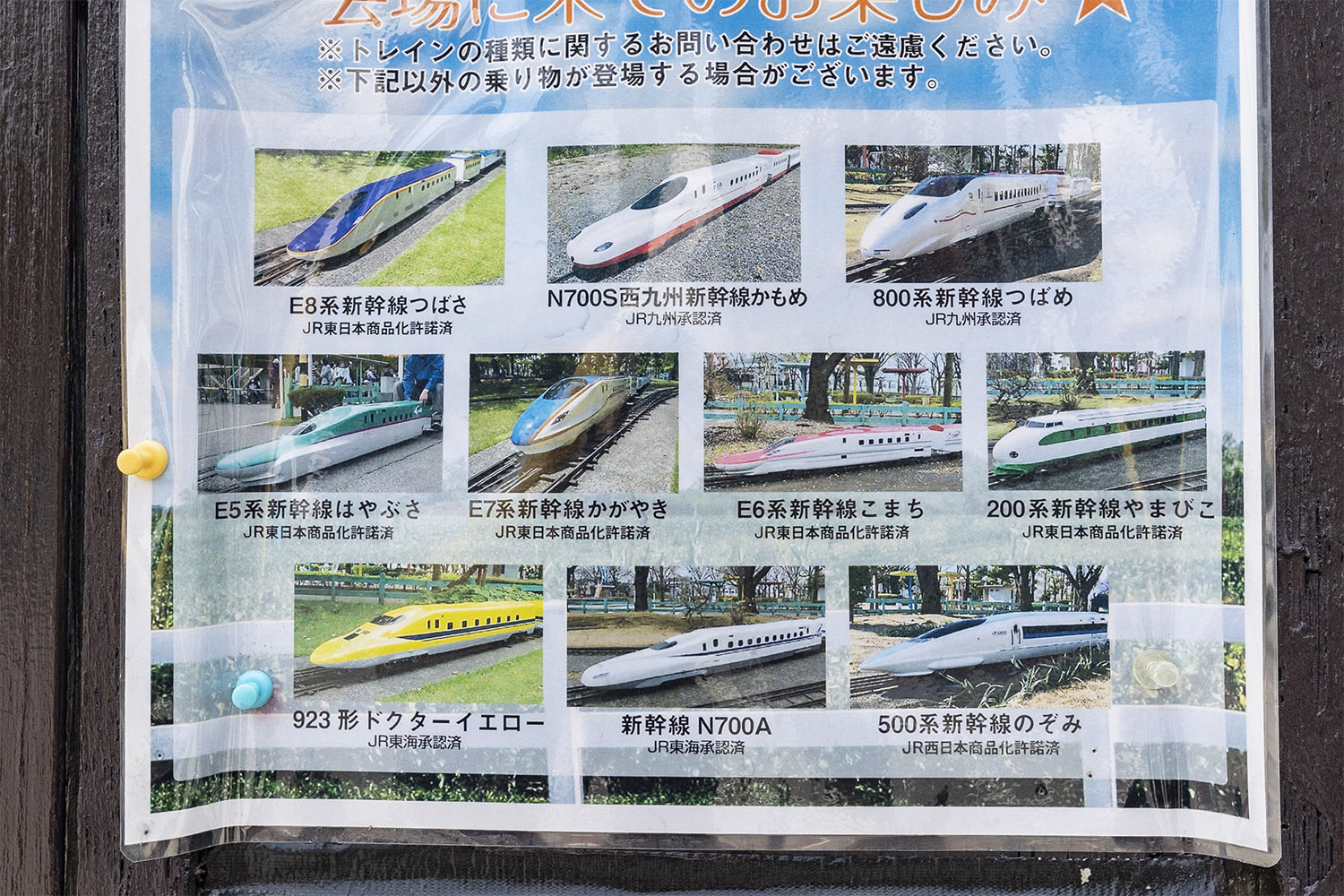 こんなに施設充実してるのに入園は無料なんだね。普通こういう交通公園の線路って、走るとしてもミニSLじゃん。ここは、はやぶさ、こまち、200系やまびこ、ドクターイエロー、N700系、500系のぞみ……各種現役新幹線のミニ版が登場するときがあるっていう。
