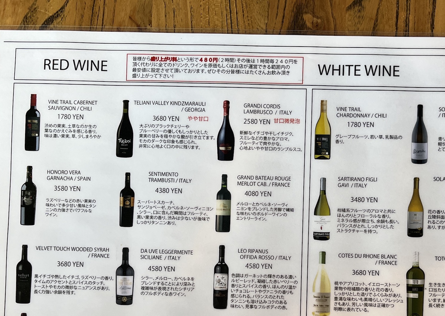 店では「盛り上がり料」というユニークなシステムを導入していて、2時間480円のチャージを払えば、グラス・ボトルともにお手頃な価格で楽しめるというものだ。