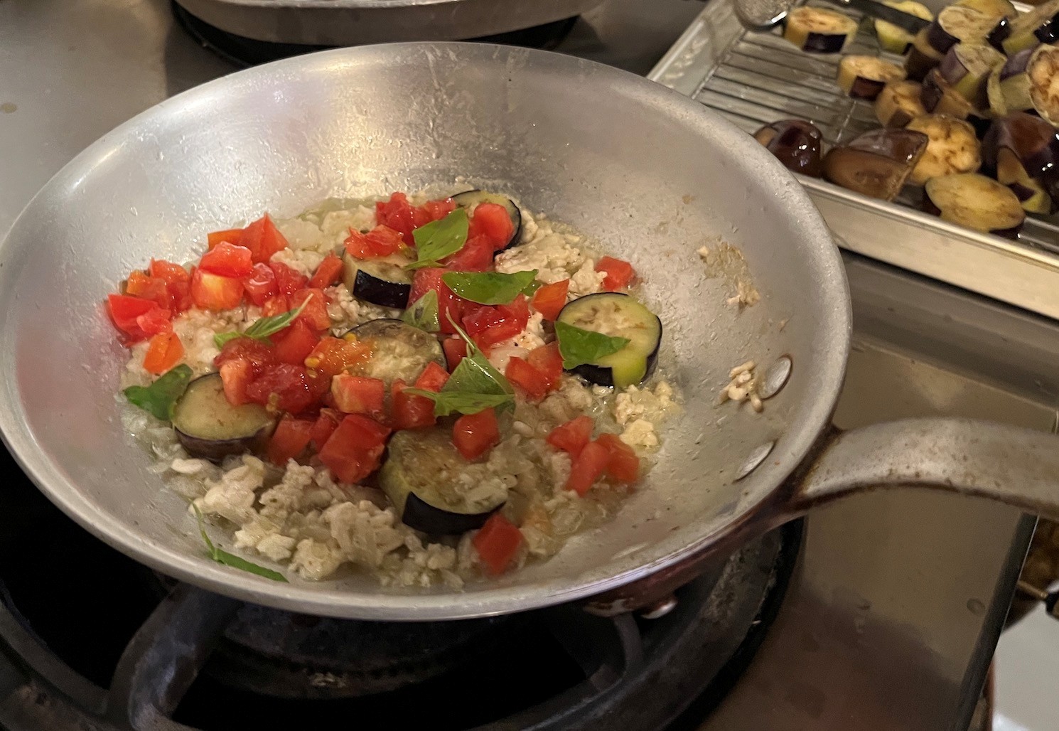 ゴロンとした鶏ひき肉はフワッとやわらかく、フレッシュなトマトの甘酸っぱさとトロッと甘いナスに、大きめに切ったニンニクがパンチをくれる。すべての素材にまろやかな塩味の一体感でまとまっているところへ、衝撃的なニンニクの香り! これが食べていて楽しい。