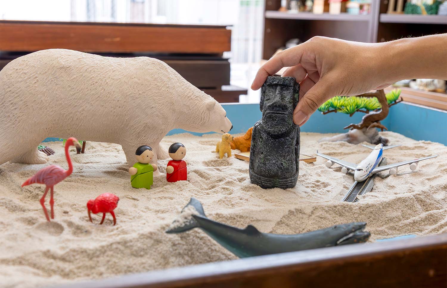 野良着のモンペを久留米絣を使い、今の生活向きにアレンジした『うなぎの寝床』の東京2号店。千川店は心理学の箱庭療法用具『メルコム』のメーカーの経営。良質な衣類も箱庭も“触る”事で癒やし効果があると一緒に展示販売。箱庭は実際に体験可能。シリコン素材含有の砂は手触りがよく、触れただけで確かに心落ち着くものがある。