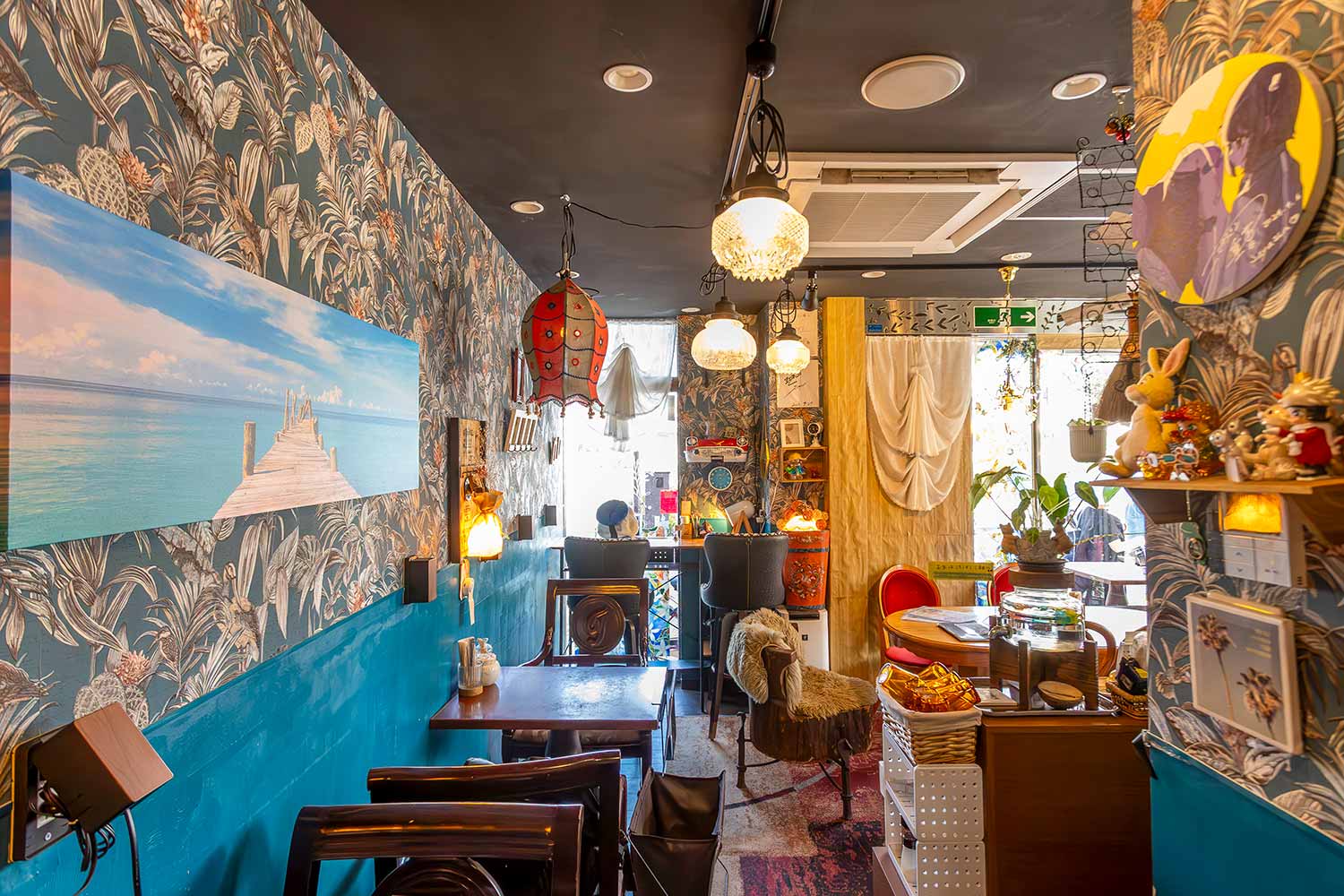 友人に好評の自作ナポリタンに賭け店開きしたSAYAさんのカフェ。ゴージャスな店内で供するナポリタンは、ソースとハンバーグの旨味が合わさり絶妙の味。固めのパンケーキや、お茶やコーヒー類も実に良い。不思議な店名は大好きだった祖母が辰年だったことに由来。ボイストレーナーのご主人・角田紘之さんのライブもしばしば開催。