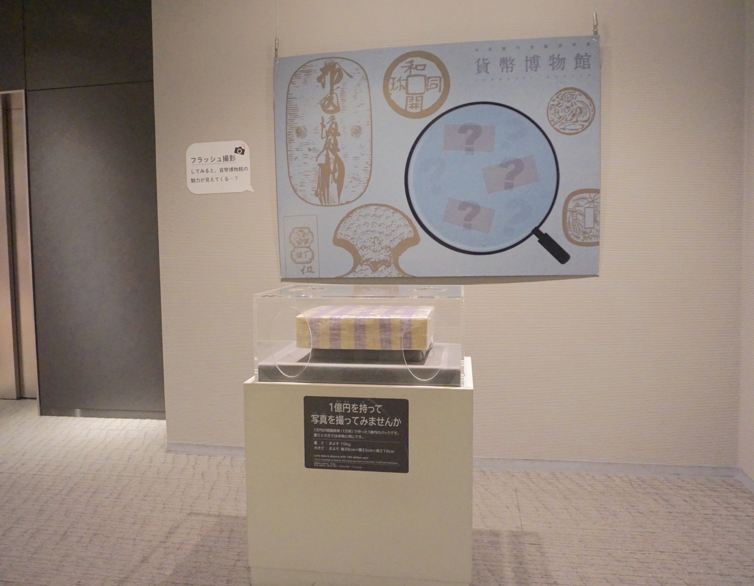展示室に続く階段を上るとまず迎えてくれるのは、1億円の札束の重さを体験できるコーナーです。