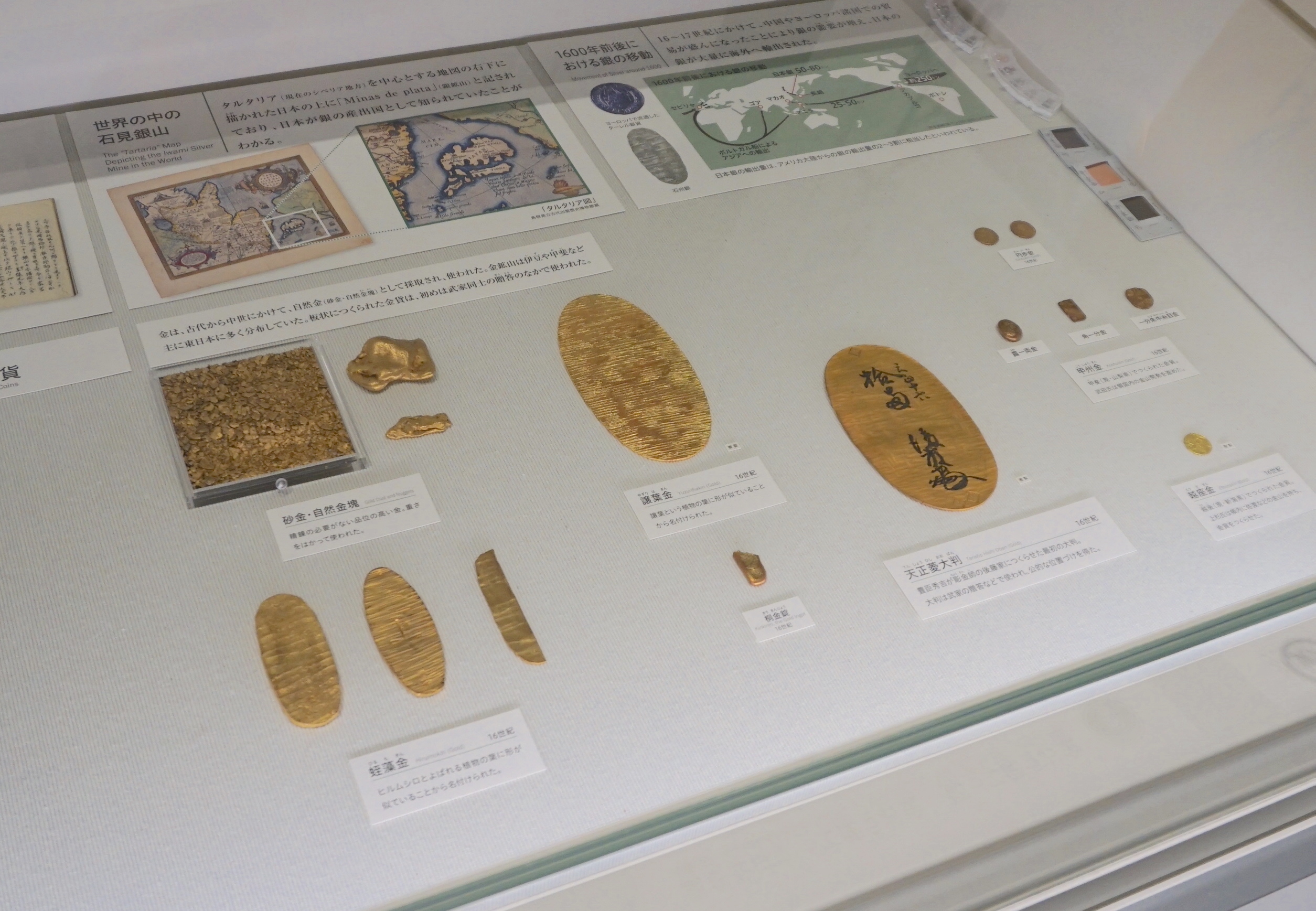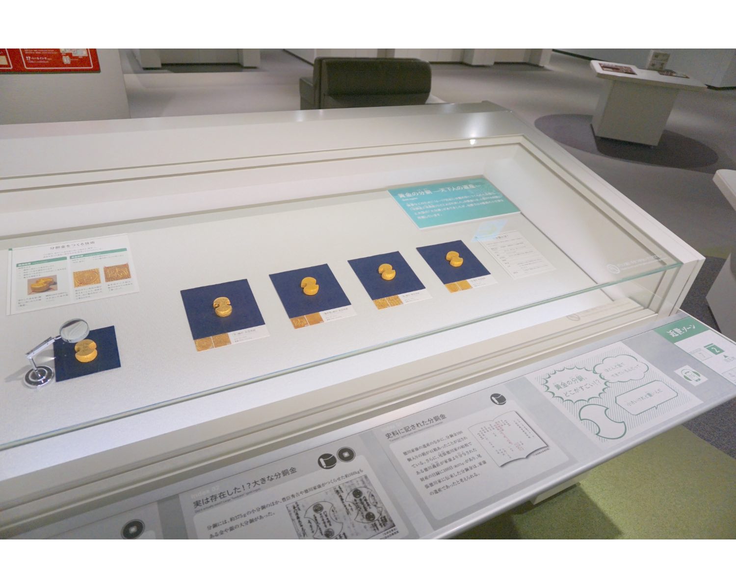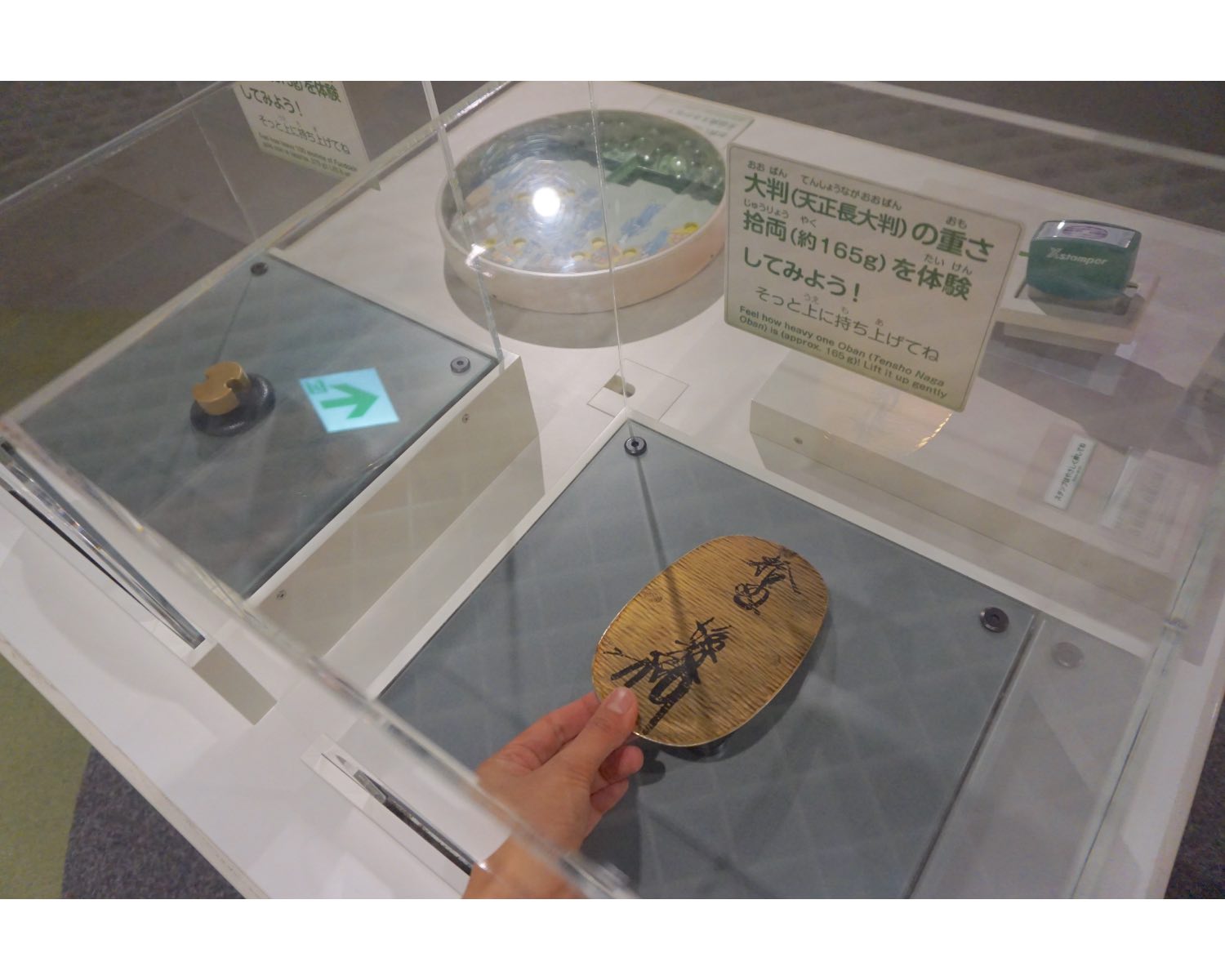大判の重さを体験できるコーナーもあります。16世紀後半に作られ、江戸時代初期にも流通していた天正長大判のレプリカで、1枚約165g。現代のアイテムでいうと、軽めのスマートフォンくらいです。