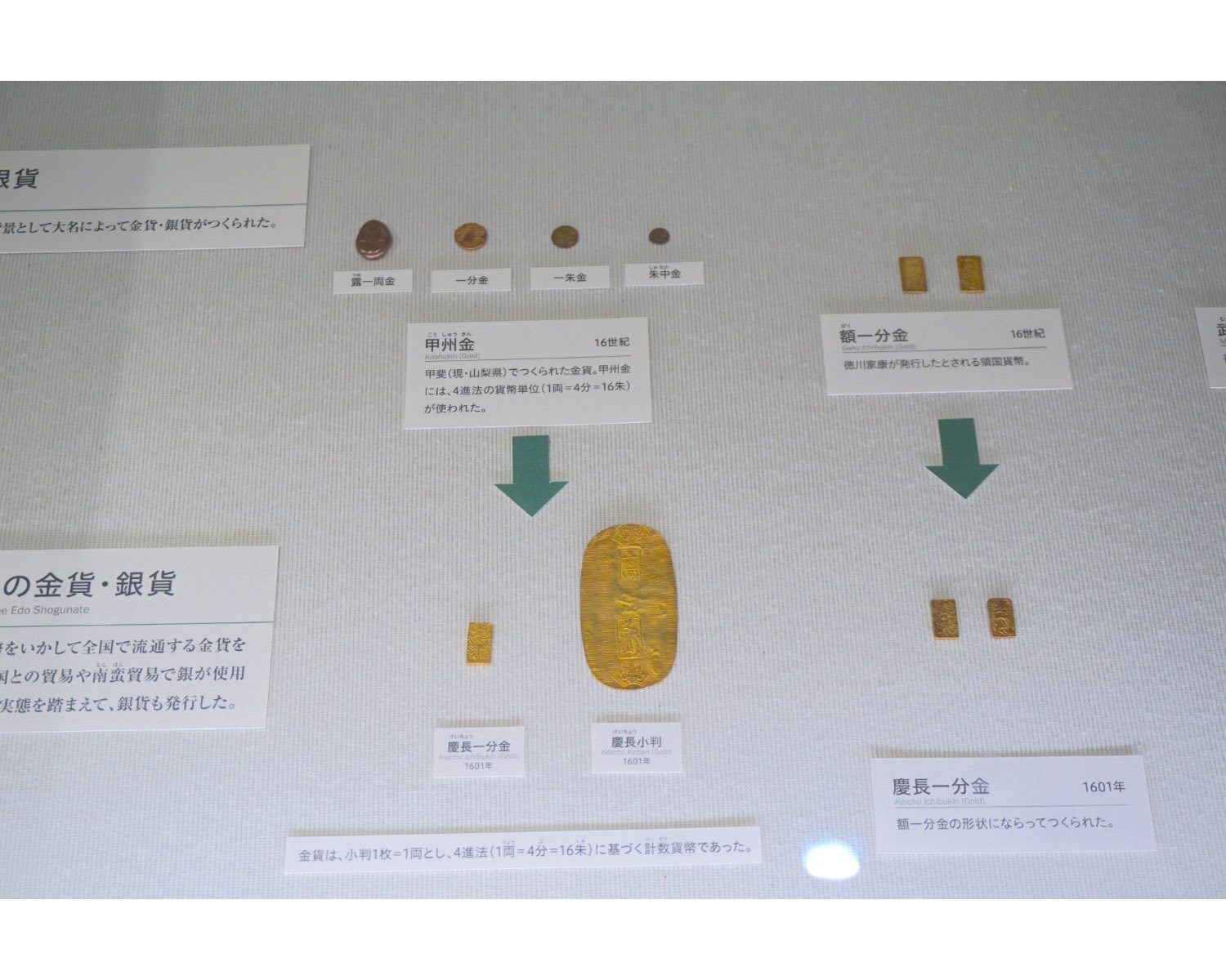 例えば、武田信玄の領地で発行された「甲州金」という貨幣の四進法の仕組みを取り入れ、金の小判1枚=1両=4分=16朱と定めたこともその一つ。