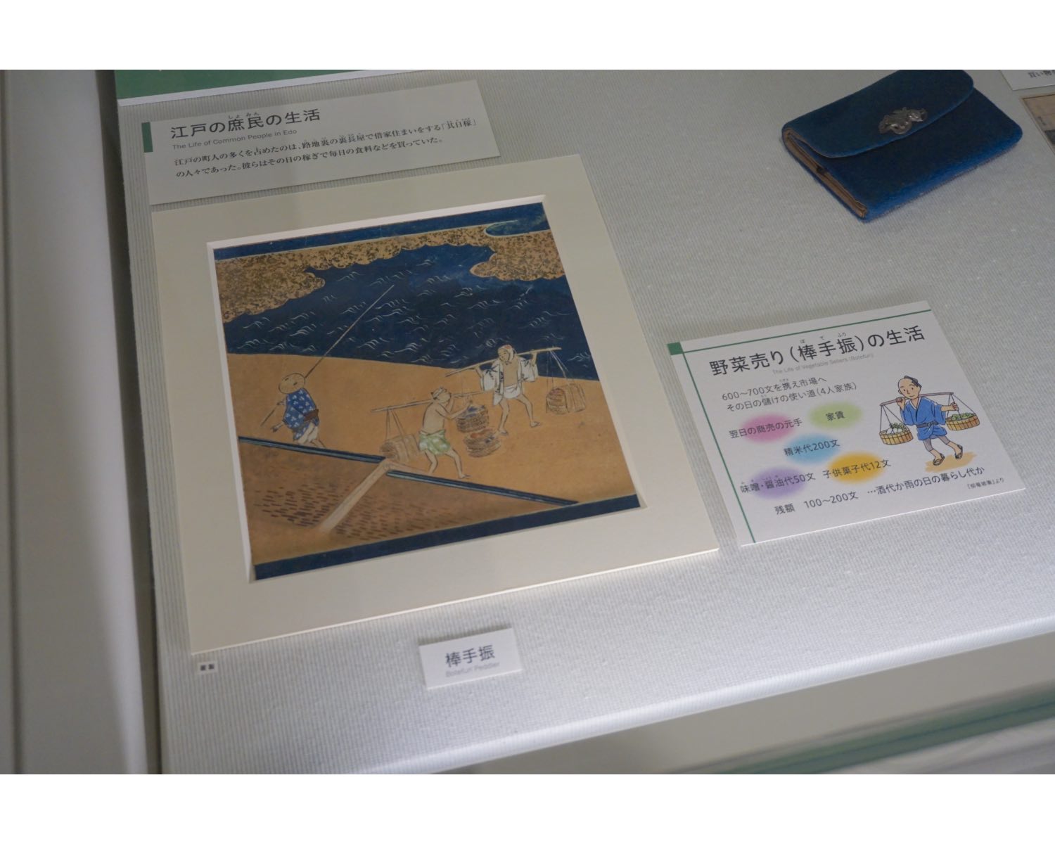 野菜を仕入れて売って暮らしていた町人「棒手振(ぼてふり)」の生活を紹介する資料も。600〜700文のお金を持って市場へ行き、仕事や買い物を終えると残額は100〜200文になったのだとか。これを酒代や、雨で仕事ができない日のために取っておいたと考えられているそうです。