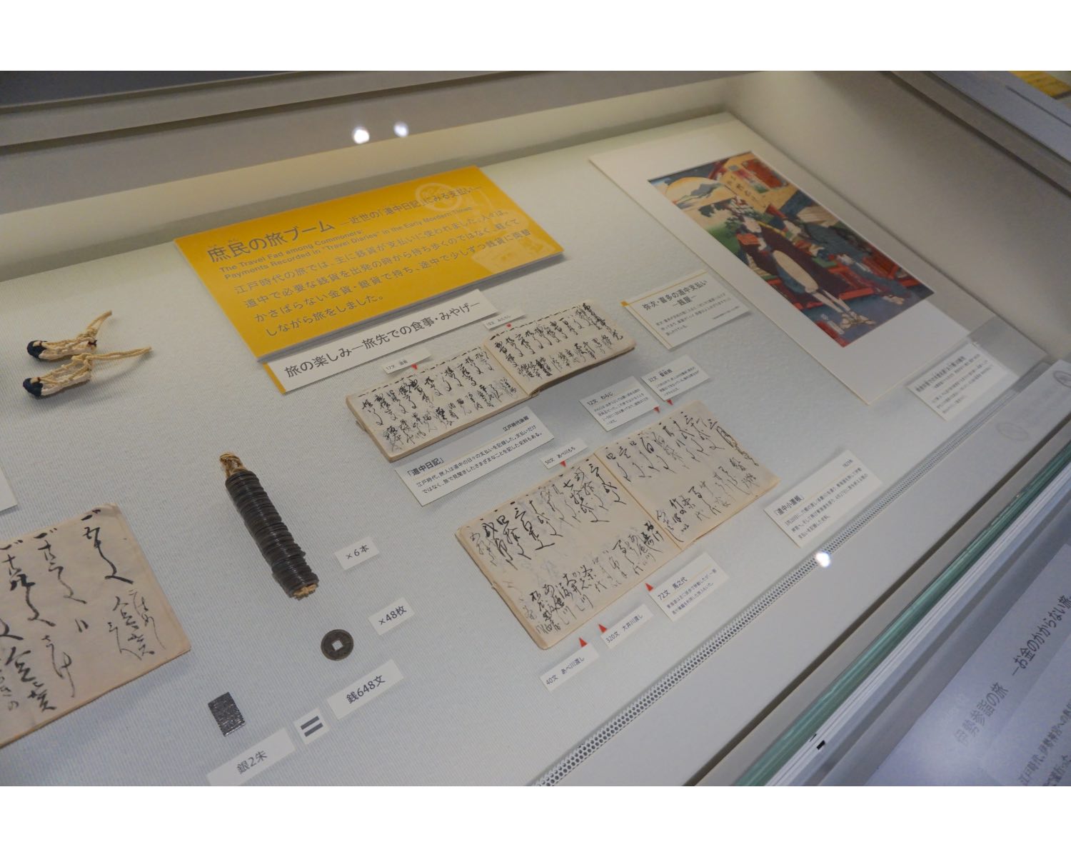 こちらは、旅人たちの持ち歩いたお金についての資料です。この写真に写っている銭貨のように、ひもでくくった状態で銭貨を持ち運んでいたのだそう。