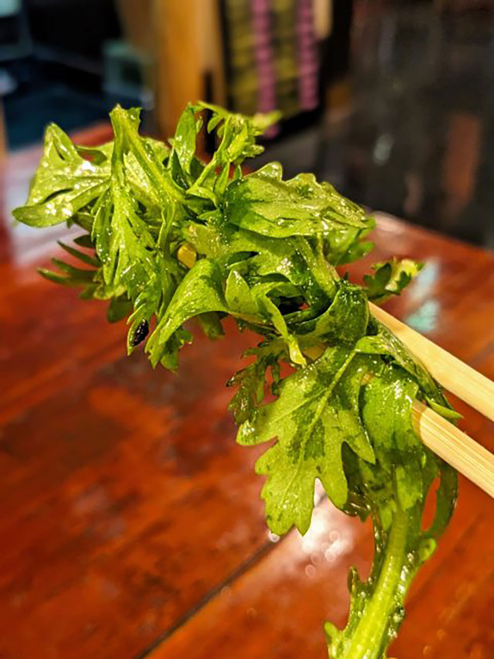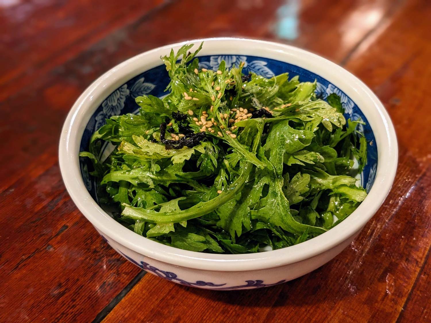 まずは「なんで今まで出会わなかったんだろう」と不思議な「春菊の塩昆布和え」から。そんな熟年恋愛のような驚きが、この春菊と塩昆布の邂逅(かいこう)にある。