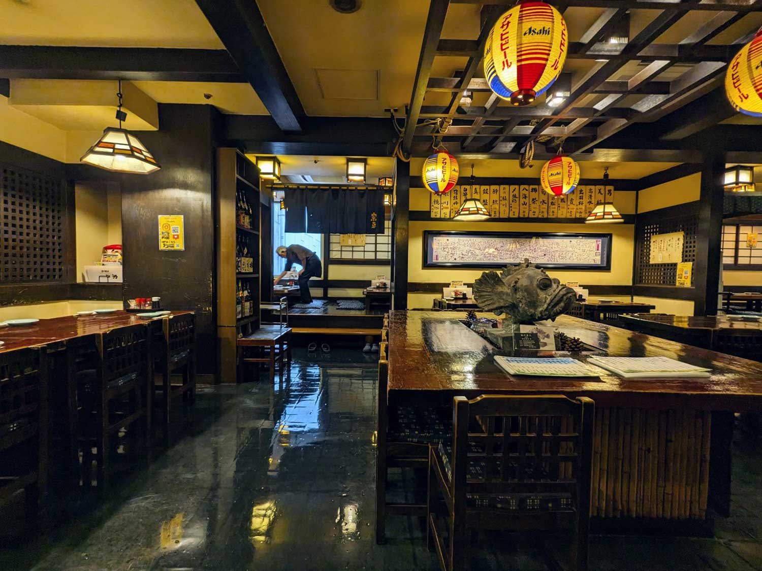 四方には広い座敷が延びていて、パッと見ではどれくらい深いのか見当もつかない。ああ、これぞ大箱総合酒場……このワクワクする感じがたまらない! 他に客は一組だけ。もちろんどこに座ってもいいと言われたので、店の真ん中を酒座に決める。
