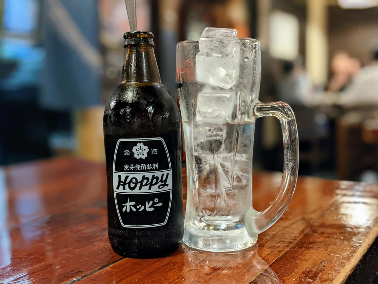 ここはやはりホッピー。スリムジョッキに氷が強めで、水位は50%くらいか。そこへホッピー120mlを注いで、アルコール度数30%程度にチューニング。いい具合に仕上がったところを……。