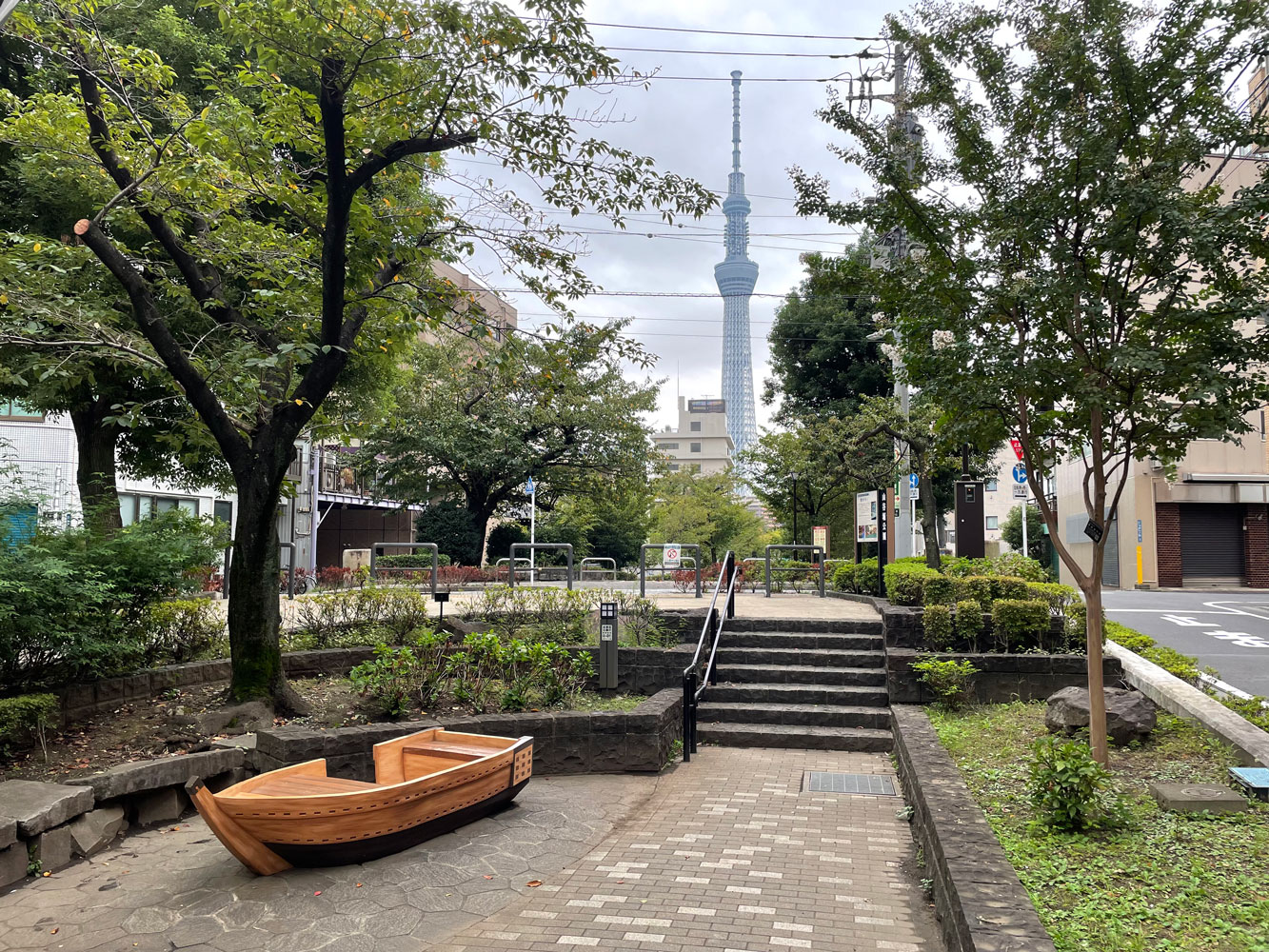 今戸神社から再び山谷堀に戻る。遊歩道上に猪牙舟(ちょきぶね)を模したものが設置されていて、観光客と思しき男女二人組が腰かけて、次はどこに行こうかと相談していた。猪牙舟とは、舳先の尖った細長い小舟のことで、山谷堀では新吉原へ向かう男たちが利用していたという。スカイツリーとセットで撮影できるポイントとなっていて、この辺で写真を撮る人も多い。