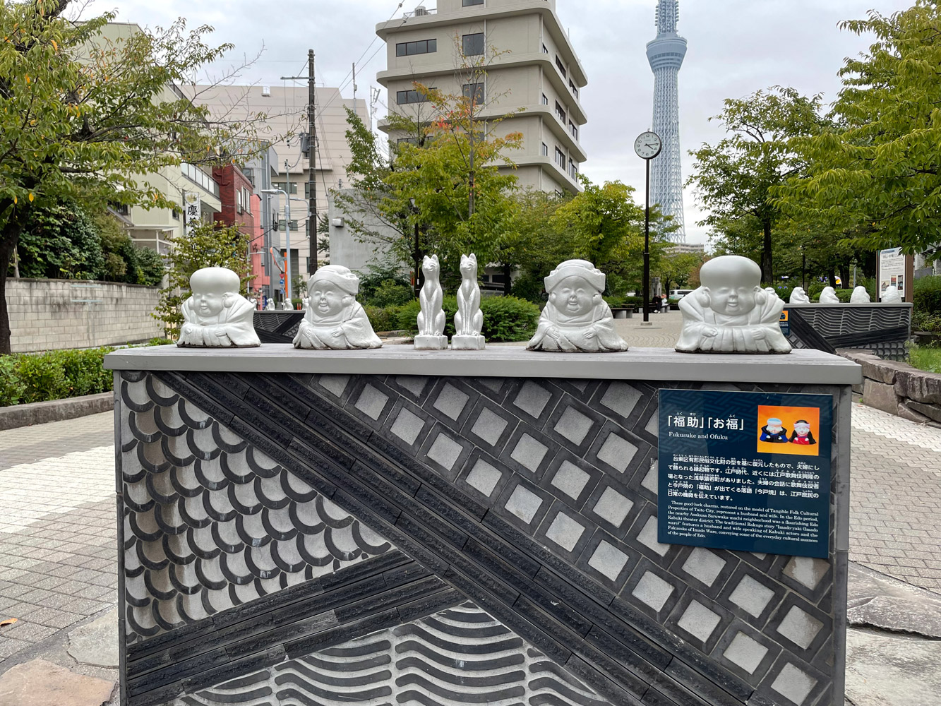 ここから橋場通りまでが日本堤側からたどって来た山谷堀公園の最終区間(今戸橋から来ると最初の区間)で、公園の幅も広がり、正面に遮るもの無くスカイツリーが聳(そび)える。この区間には江戸時代~明治・大正にかけて今戸で製造されていた焼き物「今戸焼」を模したオブジェが設置されていて、福助や招き猫、狐がちょこんと座っている姿がかわいい。公園内に設置されている解説板の記述によると、現在も今戸焼を制作している所は台東区内には1軒しかないという。ちなみに私の住む葛飾区にもかつては今戸焼の生産拠点があったそうだが、現在は残っていないようだ。
