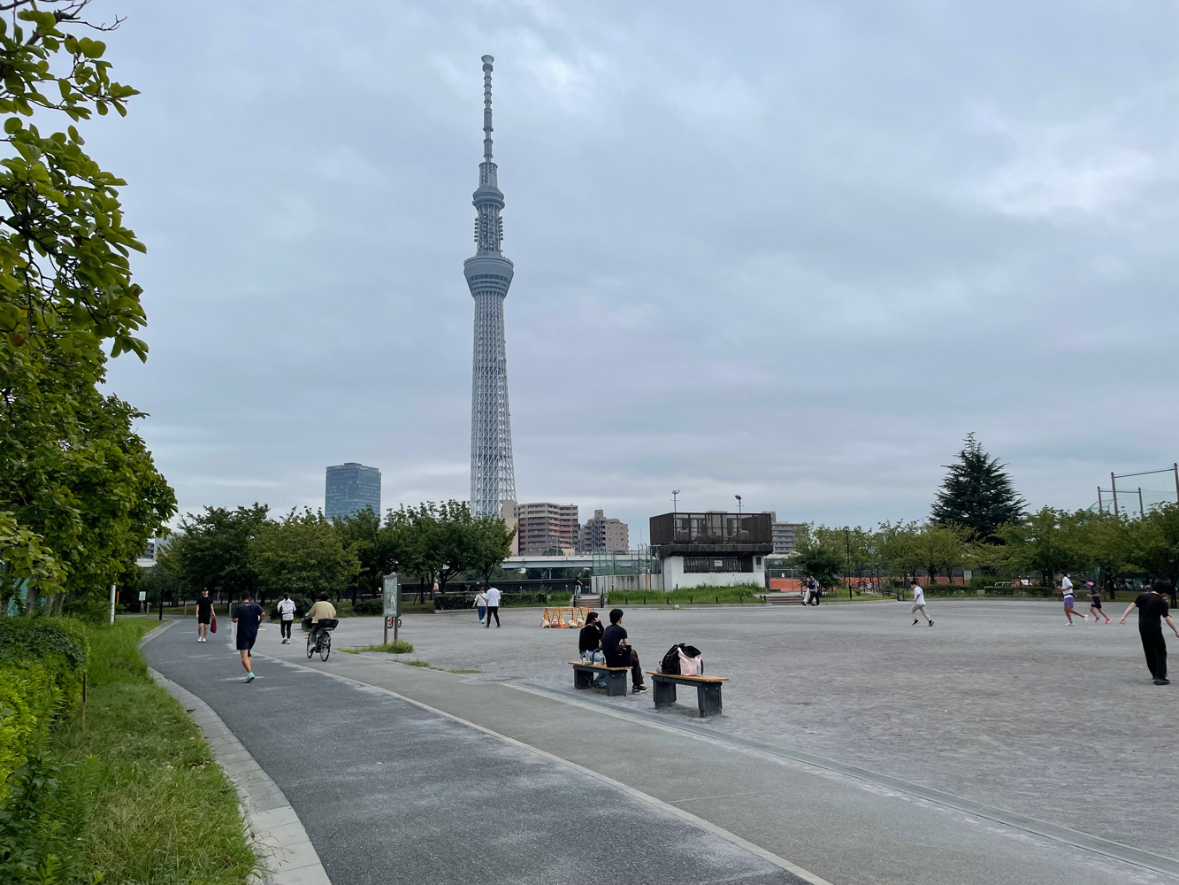山谷堀広場を通って隅田川に出る。何かのクラブ活動か、川沿いを掛け声を発しながら走る子供たちとすれ違う。台東リバーサイドスポーツセンター横の緑道では観光客や地域住民たちが行き交い、それぞれに異なる時間が流れている。