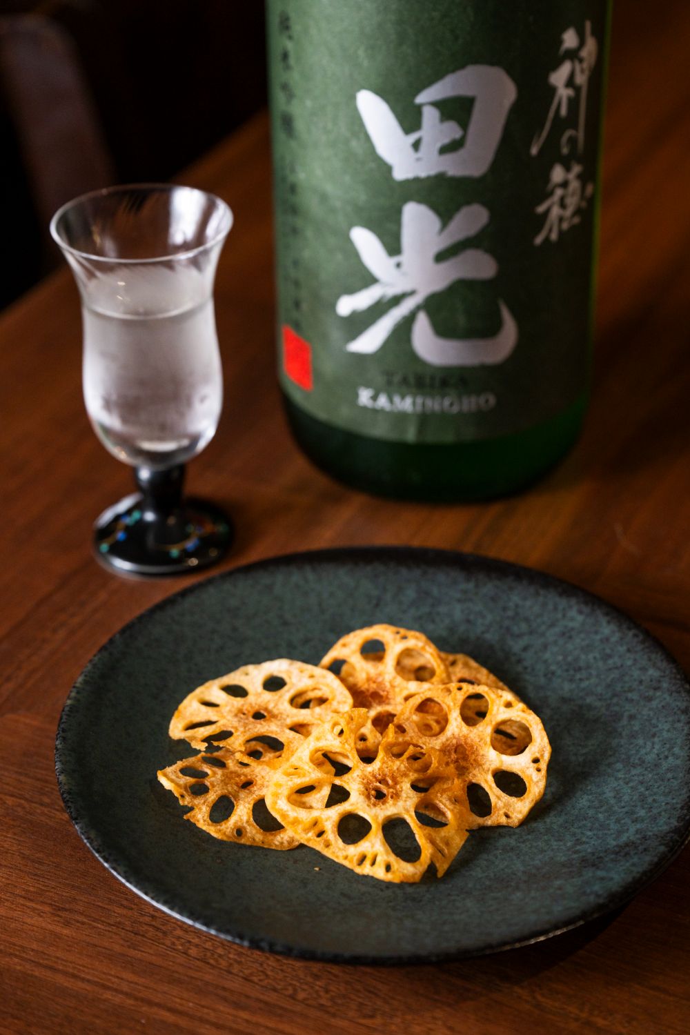 刺し身に醤油は使わず、香味野菜などの薬味で吟醸酒と伴走させたり、白和えの春菊の苦味と純米吟醸の余韻の渋みを合わせて旨味に転換させたり。料理人・花岡さんの日本酒への敬意が随所に光る。「お酒も酒も料理もおいしくなるペアリングを大切にしたい」と和田さん。幅広い酒質を揃え、提供の温度帯をふくめ、料理に合わせて丁寧に日本酒を提案。女性の一人客が多いのも納得!