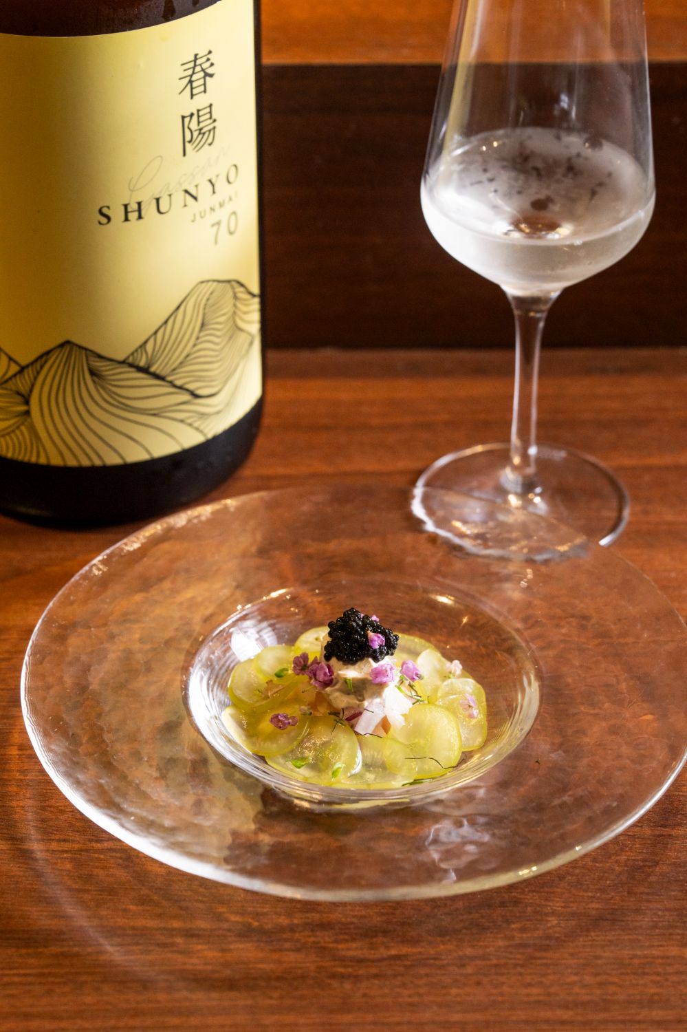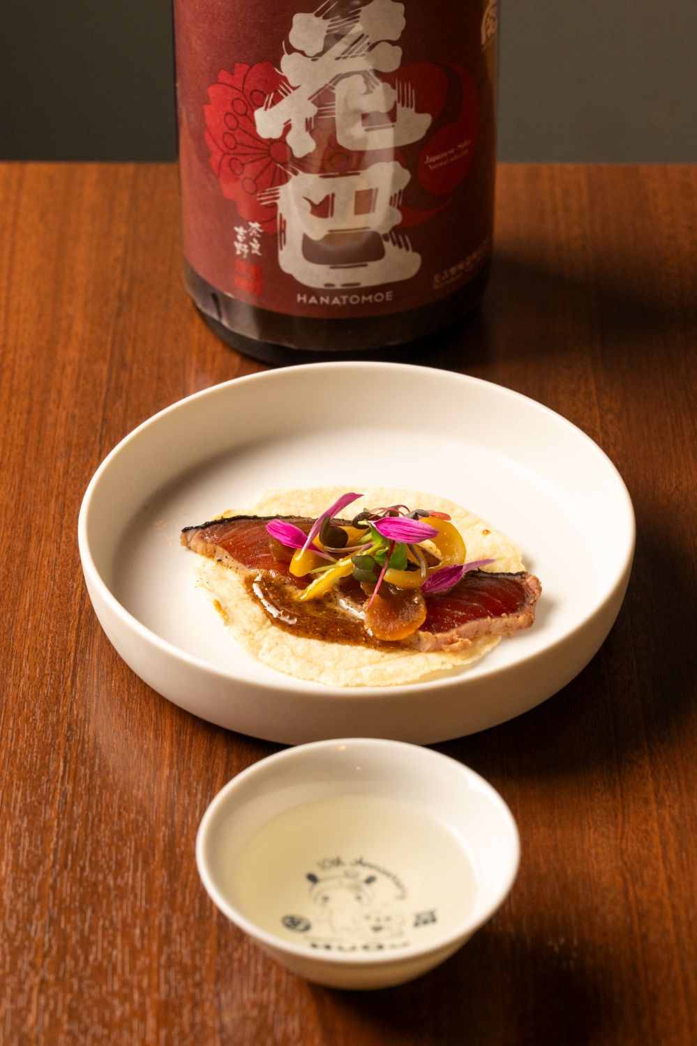 メニューは3時間フリーフローのペアリングコース1万3000円のみ。「基本は応援したい蔵の日本酒しか置かない。蔵のためにもいっぱい飲んでほしいんです」と石山さん。コース10数品は毎月替わり、この日は戻りガツオのタコスの奈良漬けの熟味と、奈良の「花巴」の酸味がきれいに伴走する。ペアリングの妙にハマる頃、4品目の八寸はお客が自由に日本酒を選べるフリータイム。あれだこれだと盛り上がること必至!