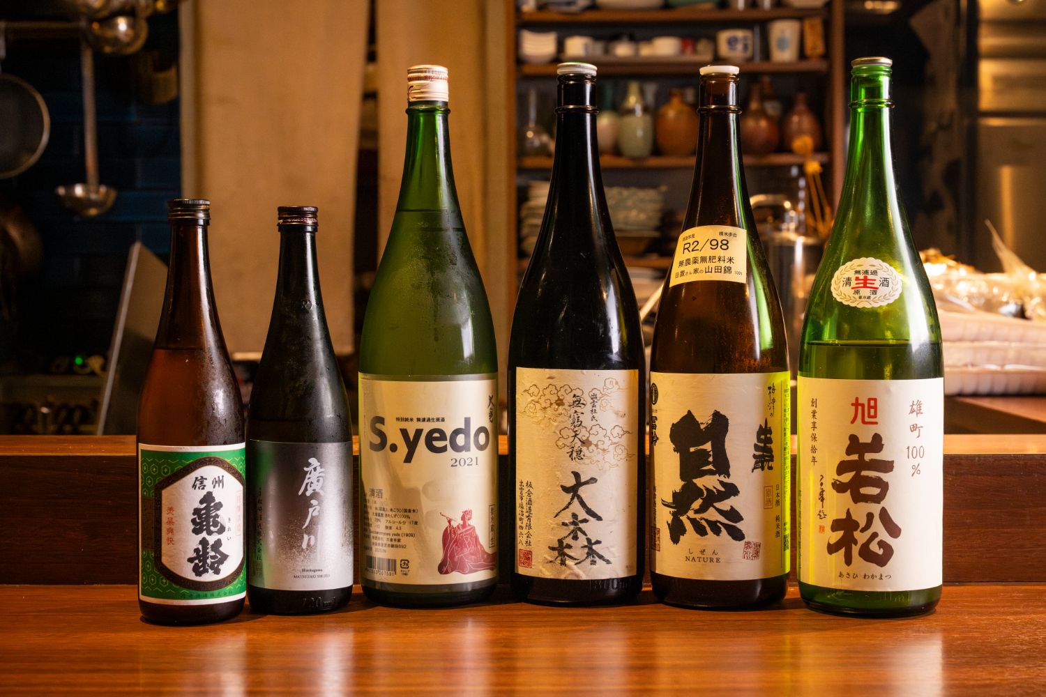 『地酒屋こだま』と、人形町の『新川屋佐々木酒店』や島根県の酒販店などから仕入れ。冷酒も燗も偏りなく楽しんでほしいことから長野の「信州亀齢」や徳島の「旭若松」まで幅広い。冷蔵庫天板のふく射熱で自家熟成させた酒も!