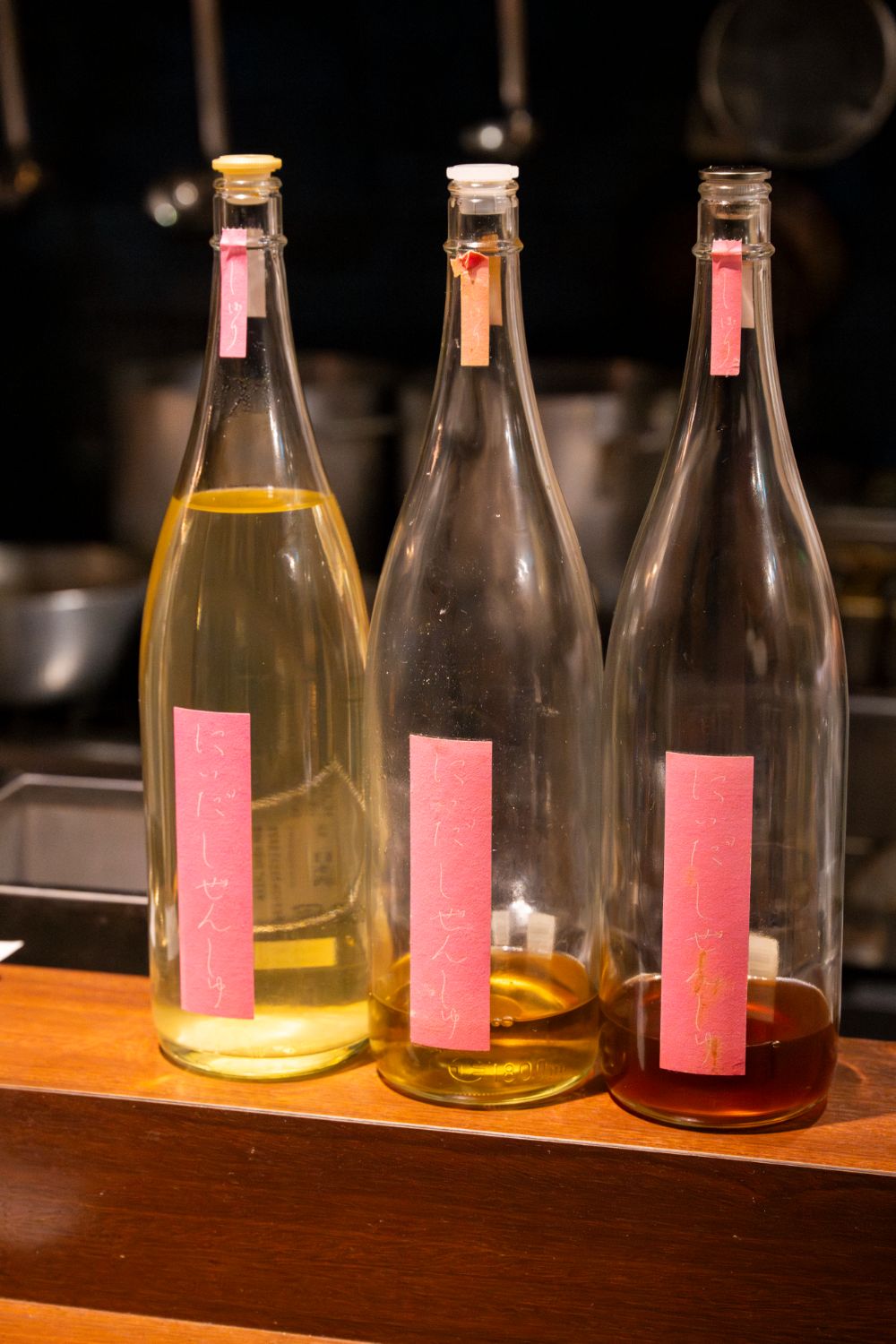 窓際に並ぶ空き瓶は既視感のない銘柄ばかり。「各地の酒蔵・酒屋・居酒屋を巡り、おいしい日本酒やおつまみを探すのが好きなの」と三好さん。長野の米農家が大信州酒造に特注した「坐(くら)」に蕎麦味噌豆腐を合わせるなど、土地土地の味覚が酔いを誘う。時には「尾鈴ラボ」と称し、柑橘類を搾ってみたり、冷酒向けをお燗したり。「おいしければなんでもOK!」と自由自在に日本酒を楽しむ女将に、乾杯!