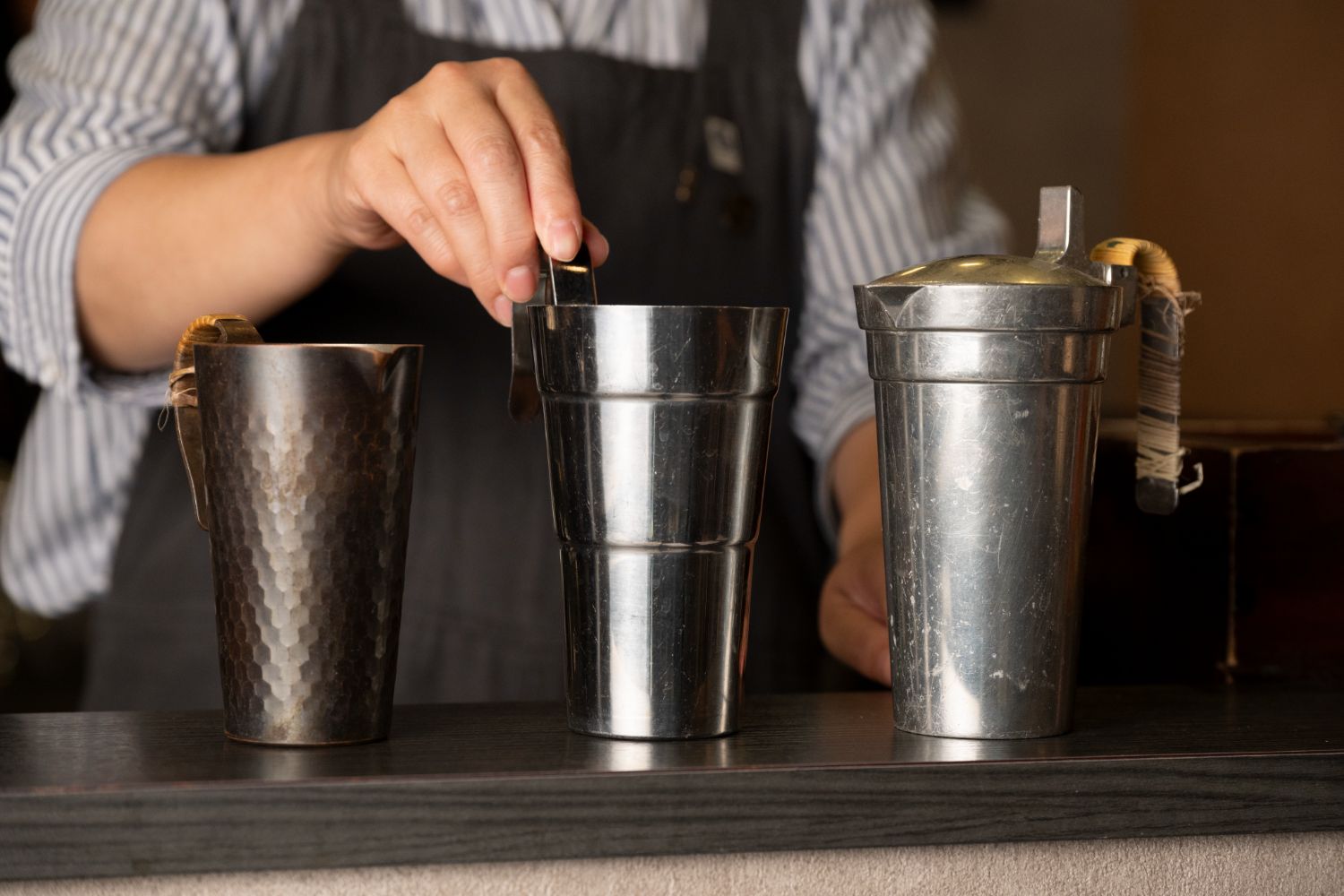 予約制の『こだまのねんりん』。夏は24時間冷房の常温倉庫で保管した生酒の熟成酒60mlと、同じ銘柄の新酒30mlを飲み比べできる。「冷蔵ではなく常温で熟成するからこそ出る熟味もあります」。お味噌など簡単な酒肴も用意。