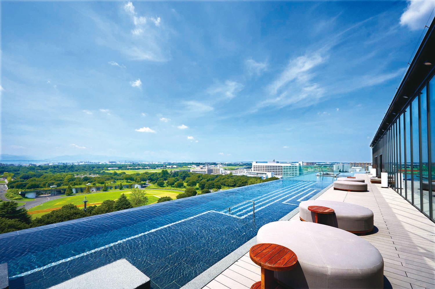 ここが都内だと忘れてしまうほど自然と一体化したホテル。昭和記念公園の四季を一望できるインフィニティプールは圧巻。夜はプロジェクションマッピングが行われ幻想的な雰囲気に。