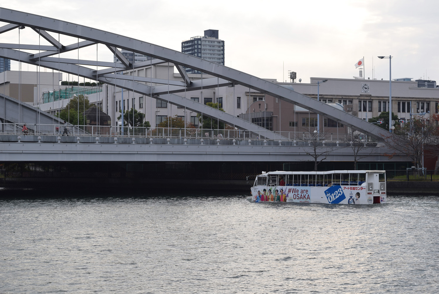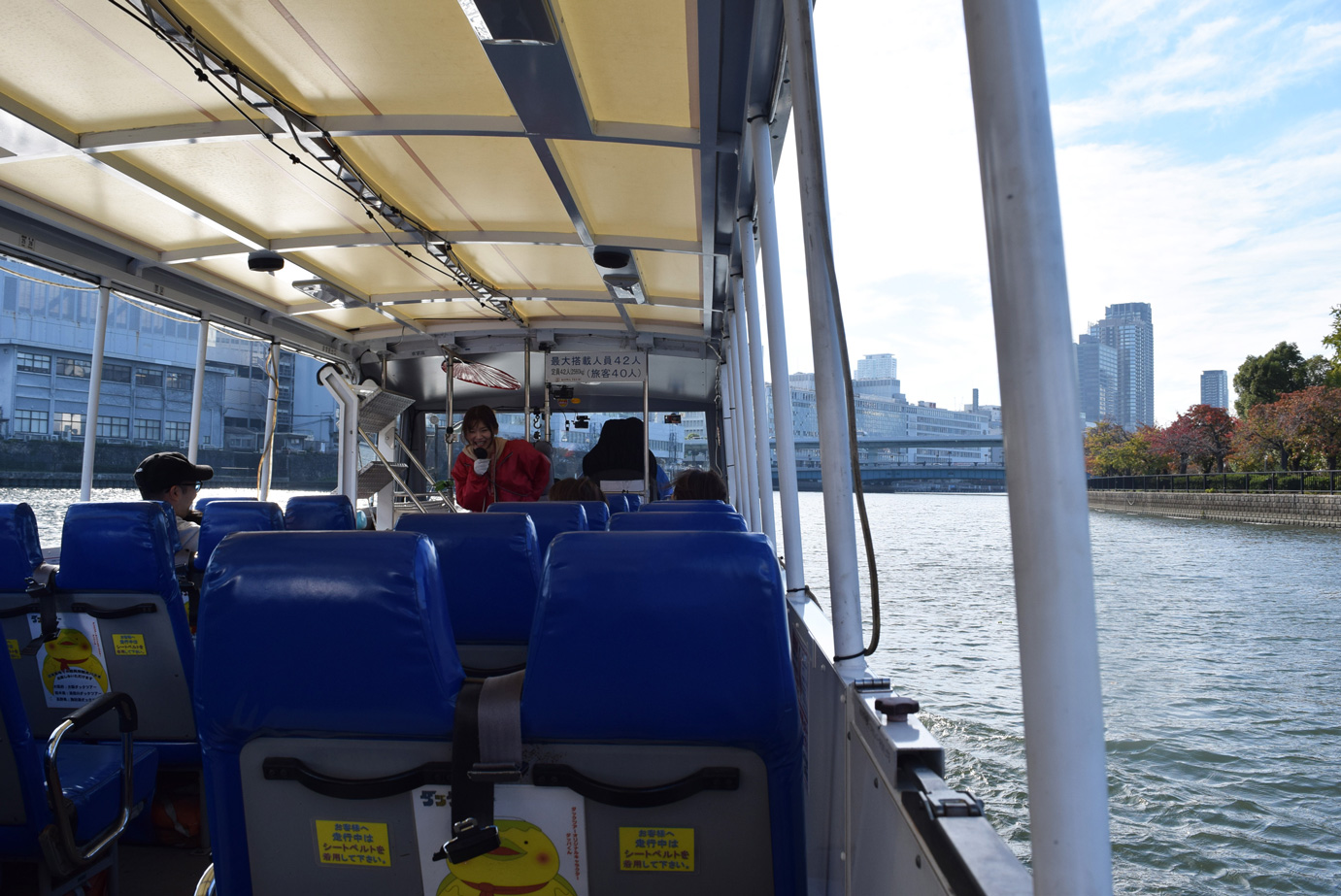 右手に大阪城がちらっと見え、バスは大川のほとりへと向かう。ここから早速川へと入っていくようだ。